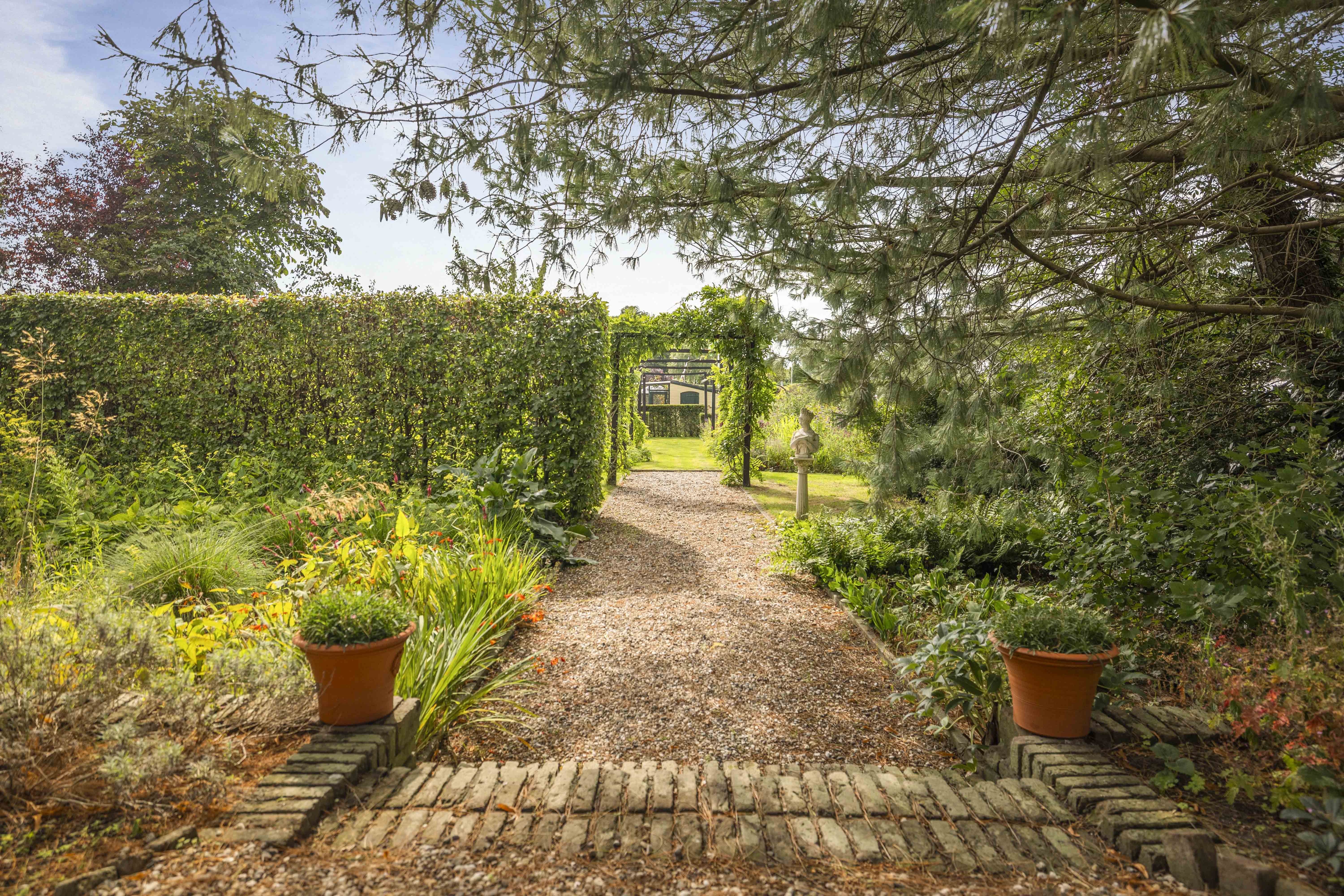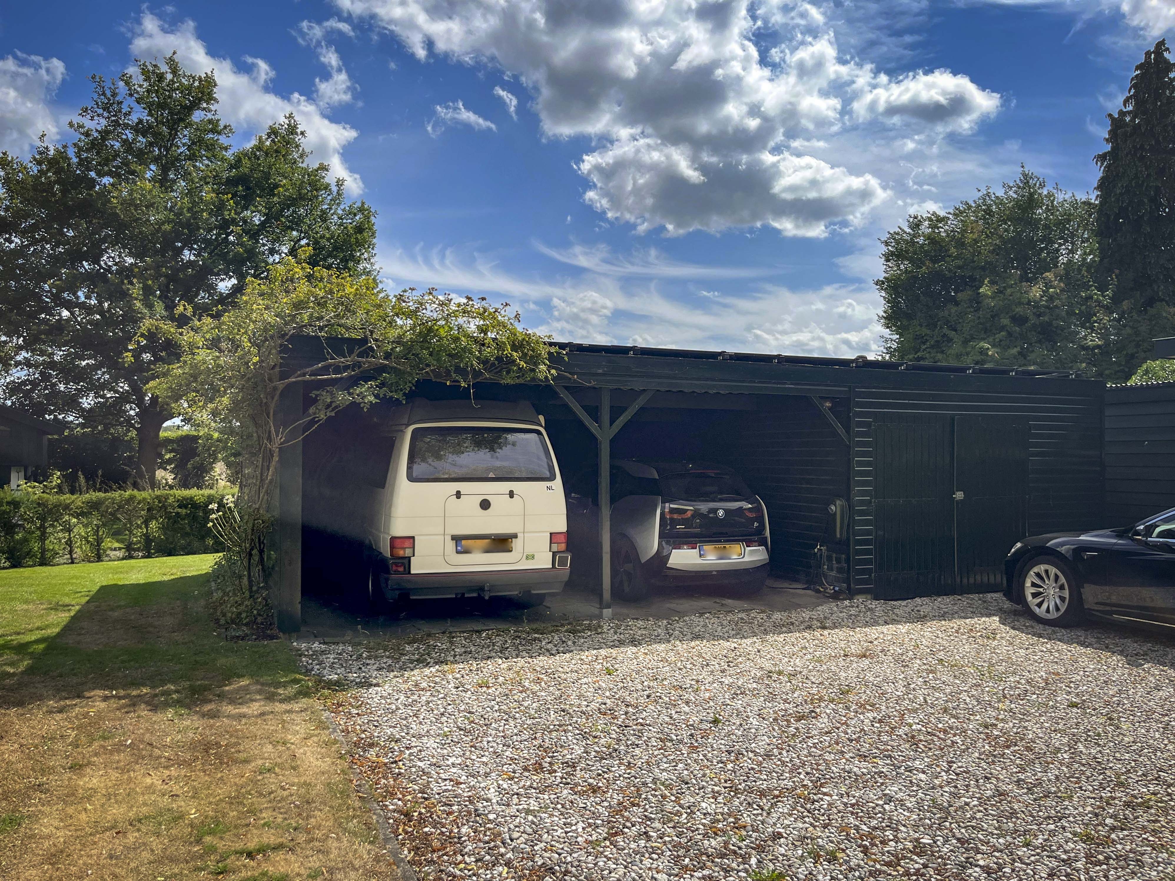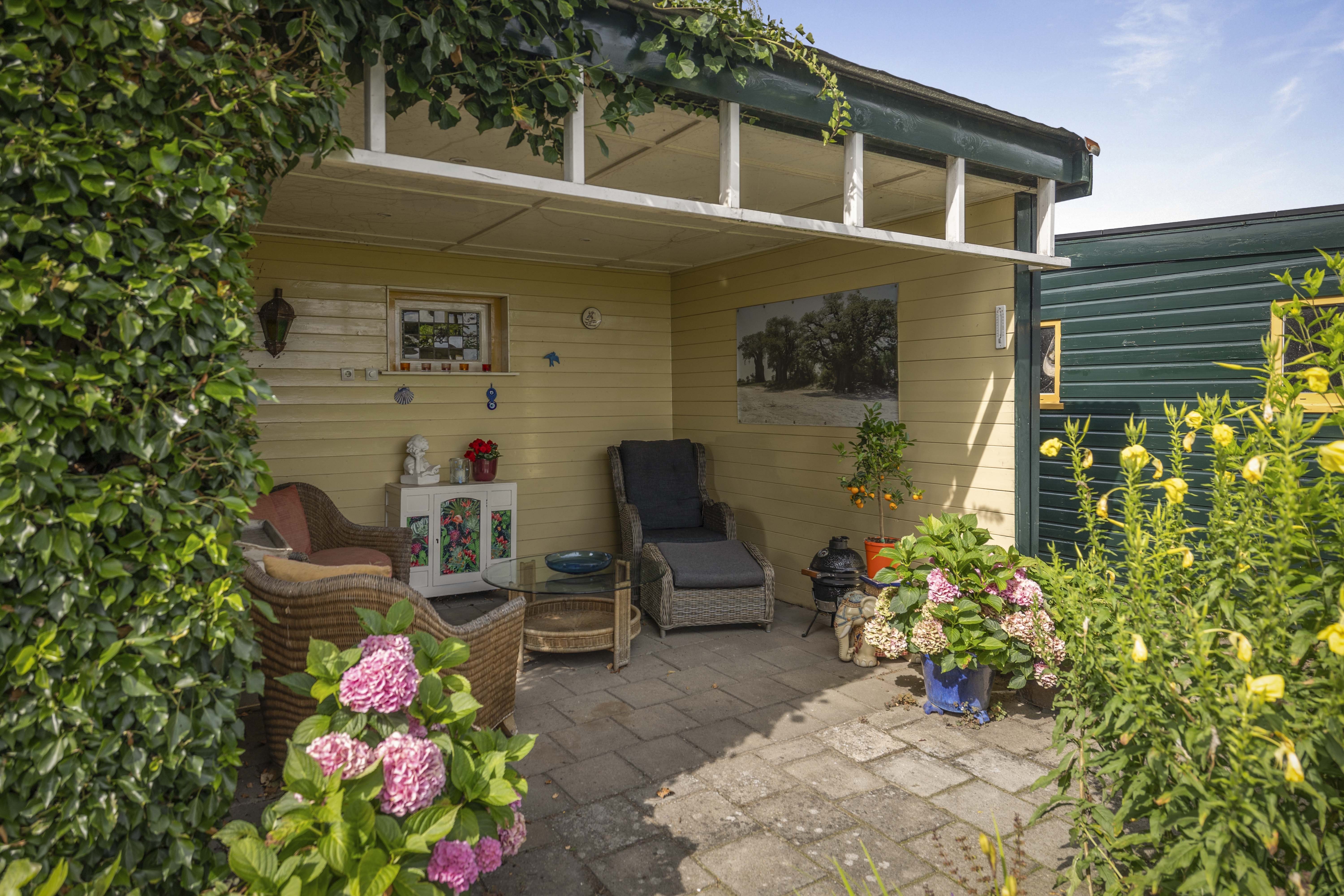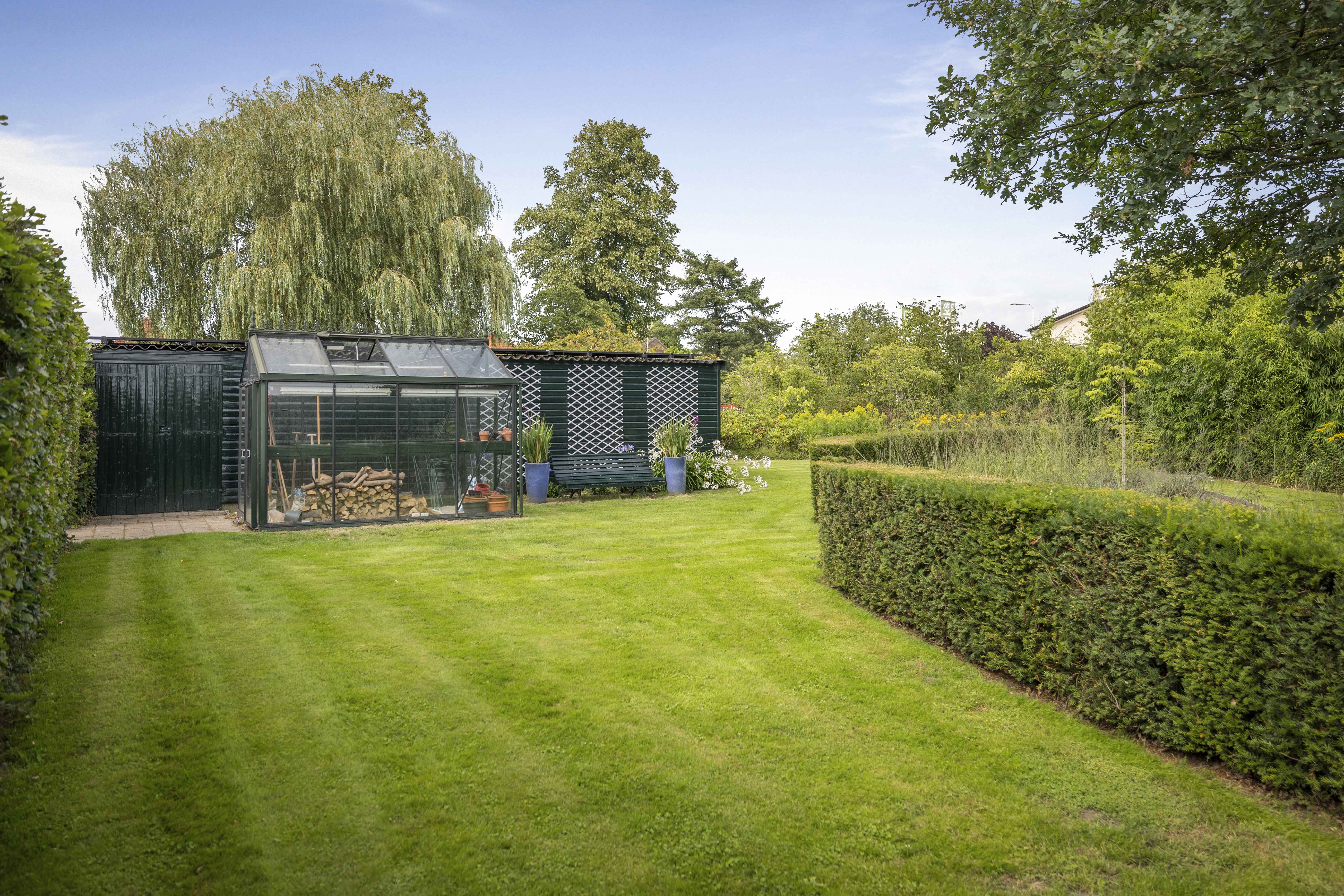 The house is surrounded by a beautiful garden. There is a wooden garage with an adjoining carport, providing space for two cars to be parked in the dry. Garden equipment can also be stored here neatly and sheltered. Due to the orientation of the house, there is a lovely sun terrace behind the property. There are cosy seating areas scattered throughout the garden. The plants are diverse, colourful and carefully chosen, making it a real treat for the senses. There are beautiful sightlines, a small flock of chickens in a cosy run and the dahlias can quietly awaken from their hibernation in the greenhouse. There are two water features and you will enjoy a great deal of privacy here thanks to the secluded location, the man-sized hedges and the mature trees.