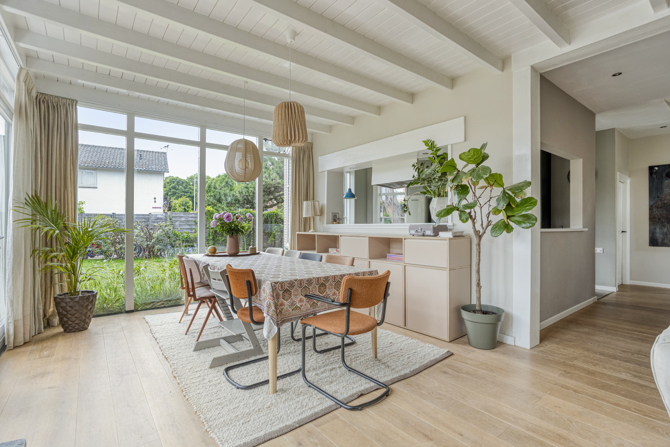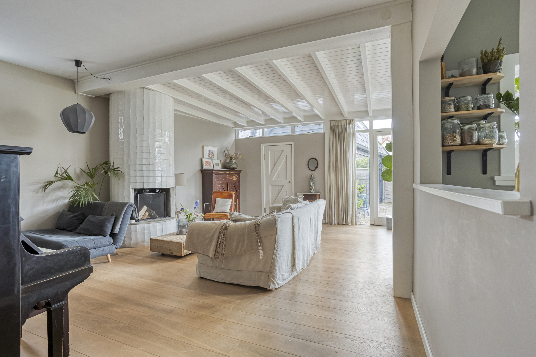 Ground floor: Entrance with hall, wardrobe and separate toilet. Side room, now used as a bedroom. Front room, now used as a bedroom / guest room. Open living room with central fireplace and adjacent to the garden a dining area for 12 people with patio doors to the garden. Semi-open kitchen with breakfast corner. Passage from the living room to the annex.