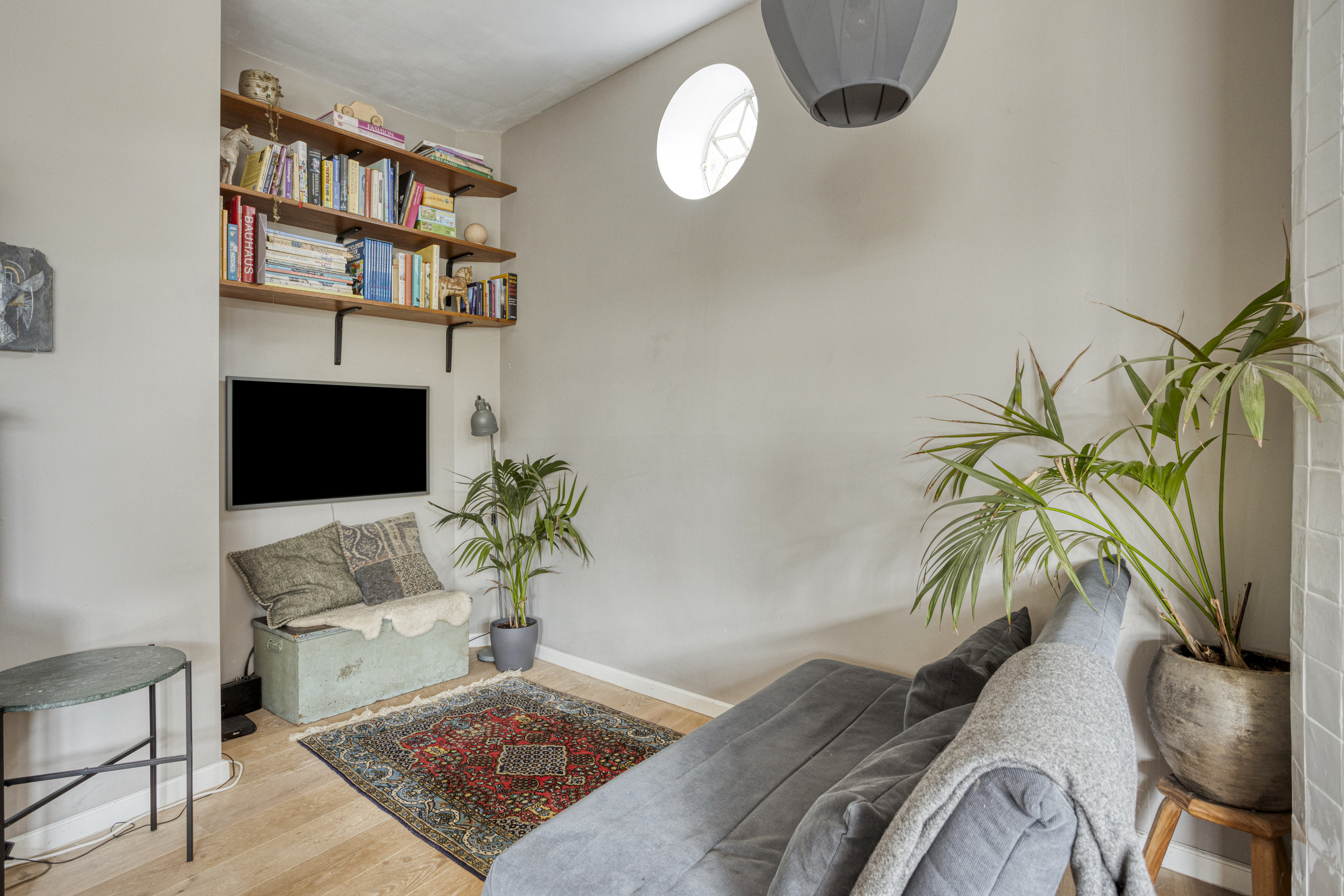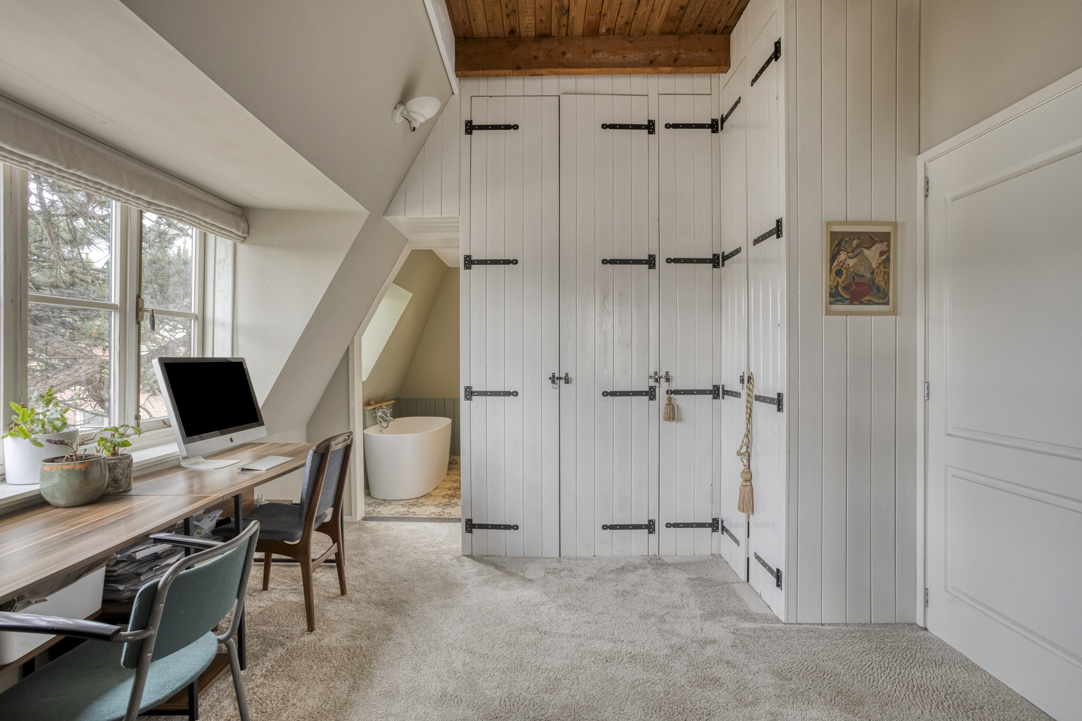 Ground floor: Private entrance from the garden with hall and stairs to the 1st floor. Living room, currently used as a home office, with bathroom with shower and toilet and laundry and cupboard space in the interior to the house.