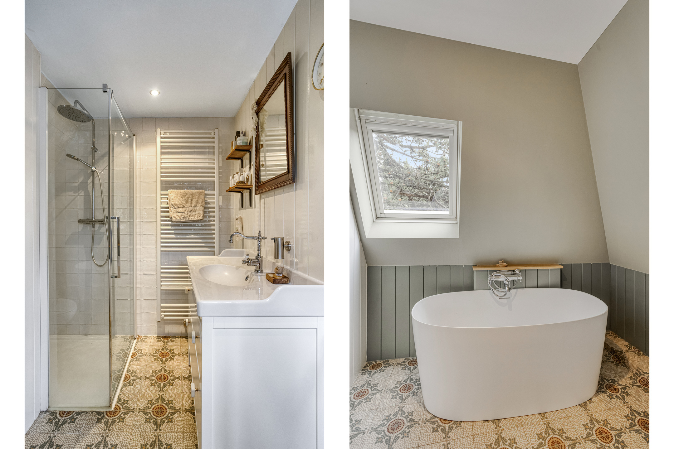 1st floor: Landing with access to the bedrooms and bathrooms. Master bedroom with sleeping loft and ensuite bathroom with shower, bath and toilet. Two children's bedrooms with a shared bathroom with shower and toilet.