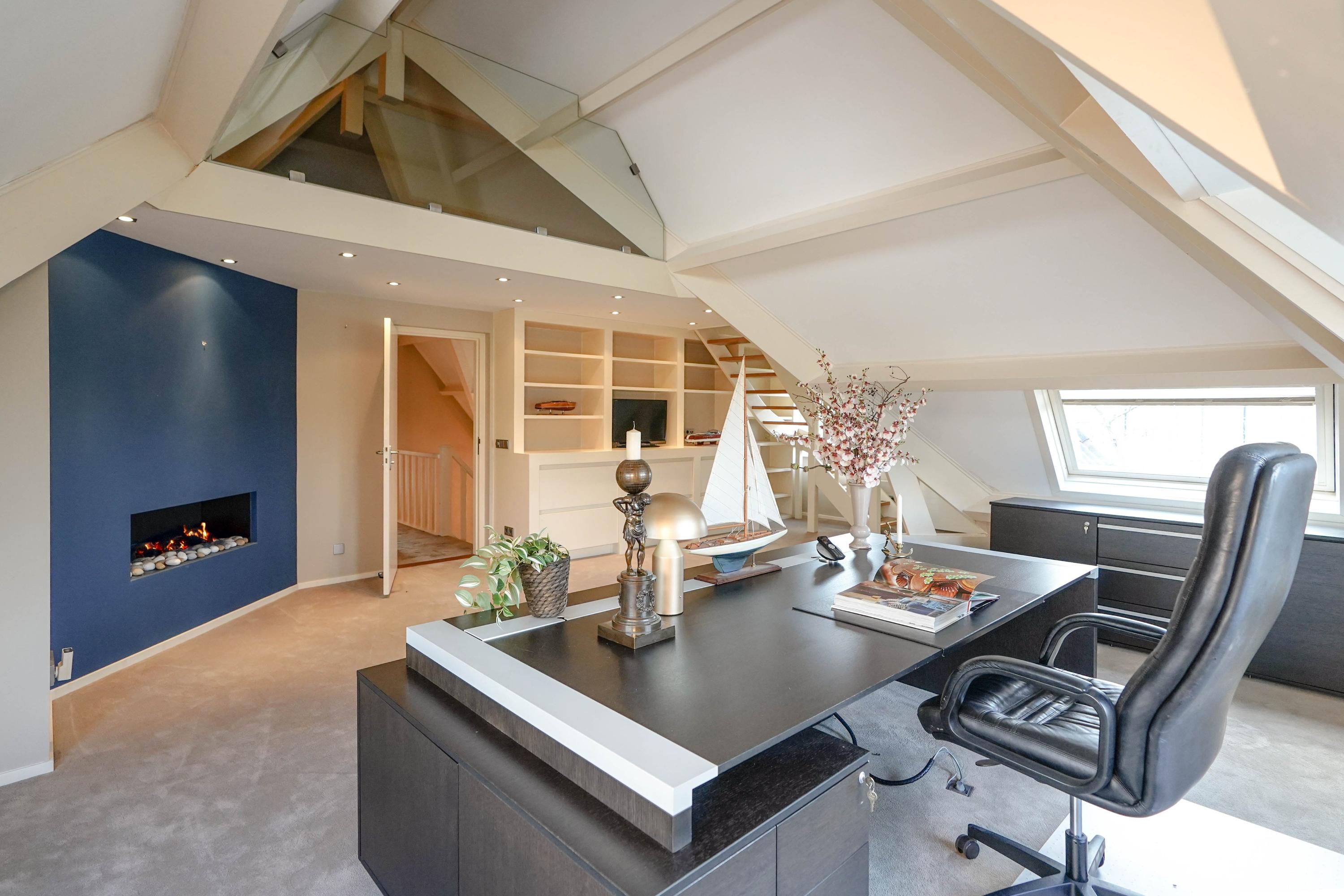 Landing, the first bathroom with shower, double sink and a toilet. Two spacious, identical children's bedrooms with a fixed staircase to a sleeping loft. The master bedroom has its own bathroom en suite (equipped with underfloor heating), fixed cupboard wall and French doors to a roof terrace with breathtaking views. Last but not least, on the first floor you will find the very spacious study with gas fireplace, view of the water, custom-made built-in cupboards and a fixed staircase to the vide and large storage attic.