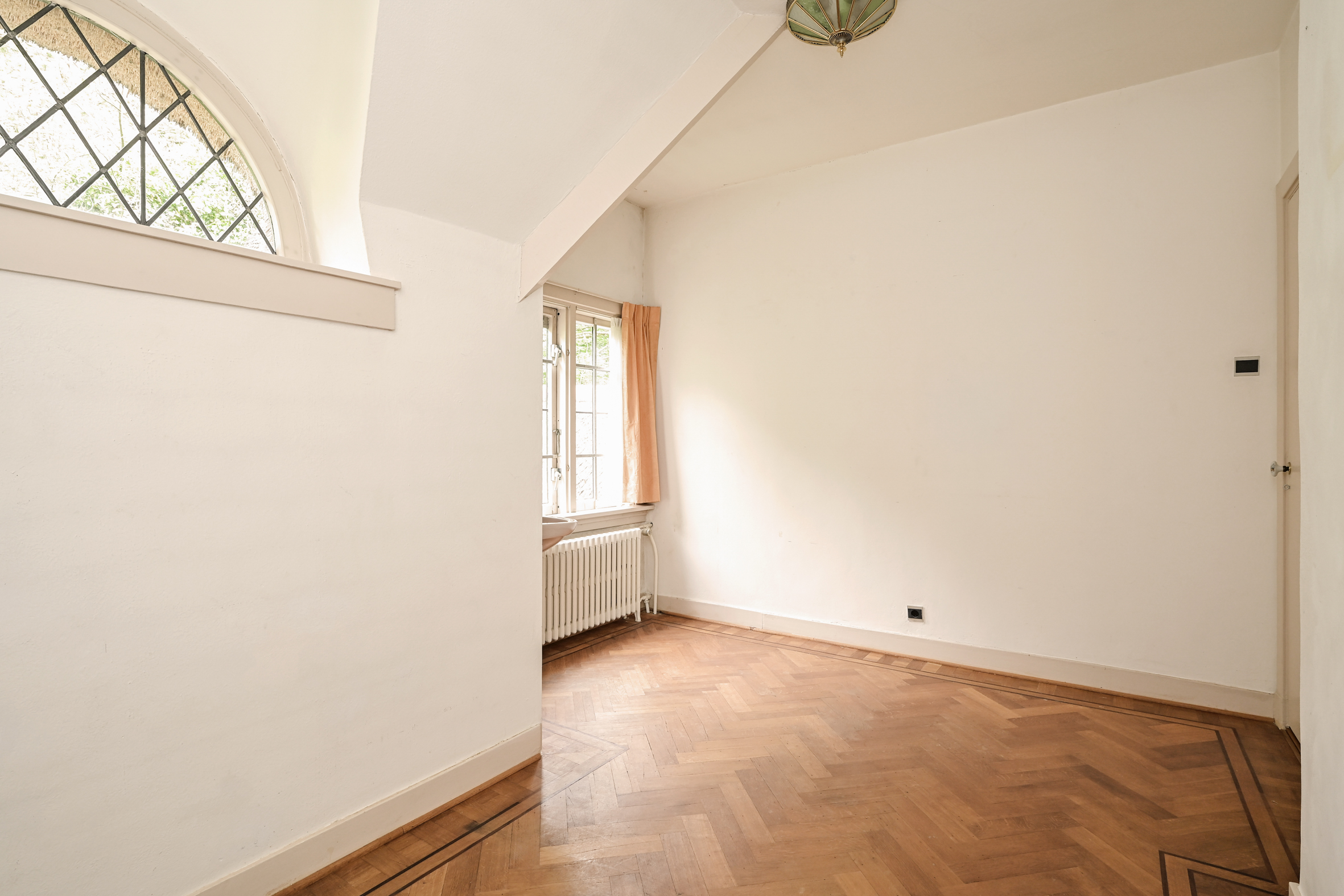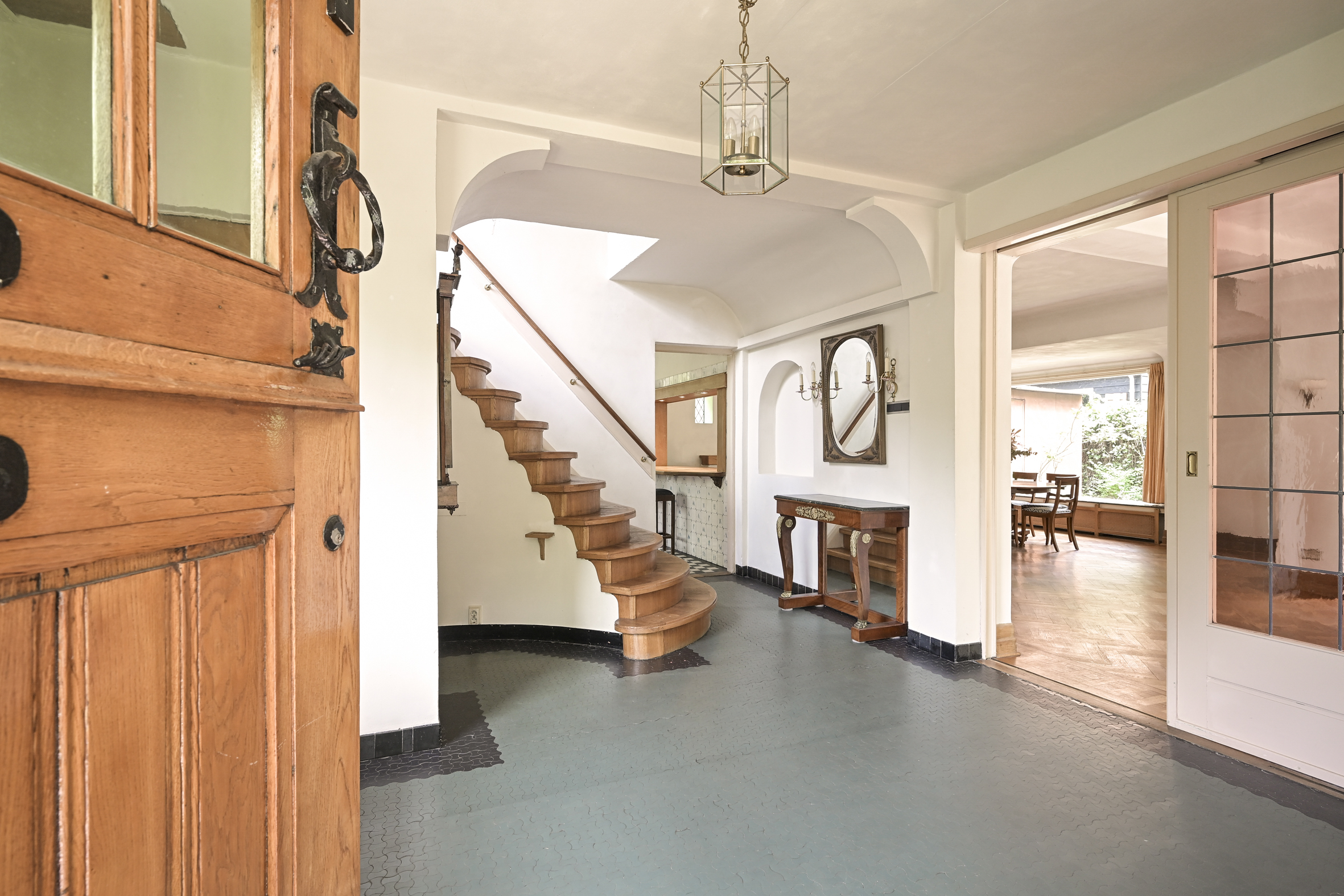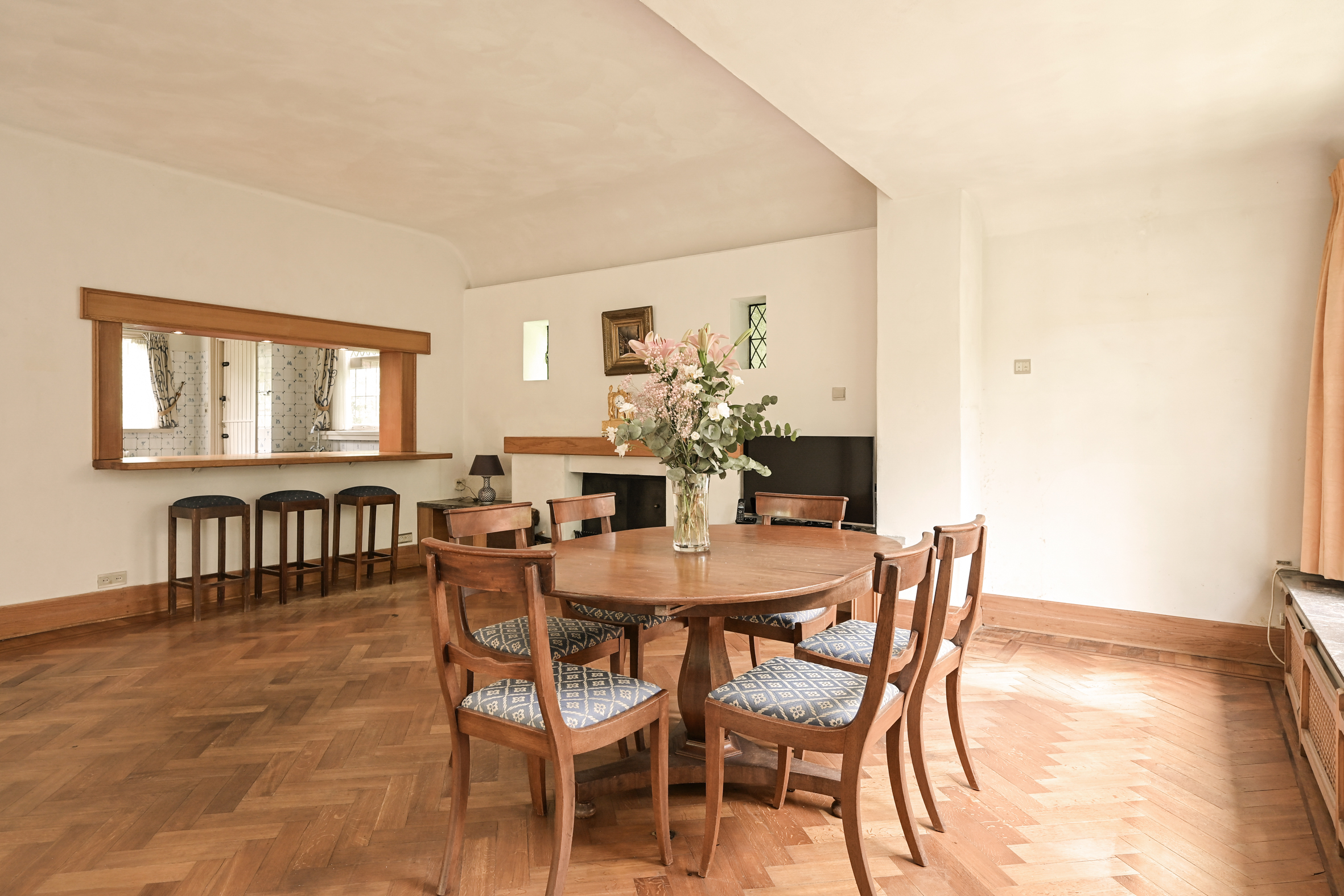 A spacious hall welcomes you with mosaic flooring, leading to an elegant living and dining area with stained glass sliding doors, fireplace, and marble windowsills. This flowing space opens directly to the garden, inviting natural light and outdoor ambiance. The kitchen, set with a semi-open plan and direct garden access, adjoins a practical utility room as well as a cellar of 23 m² arranged in three rooms.