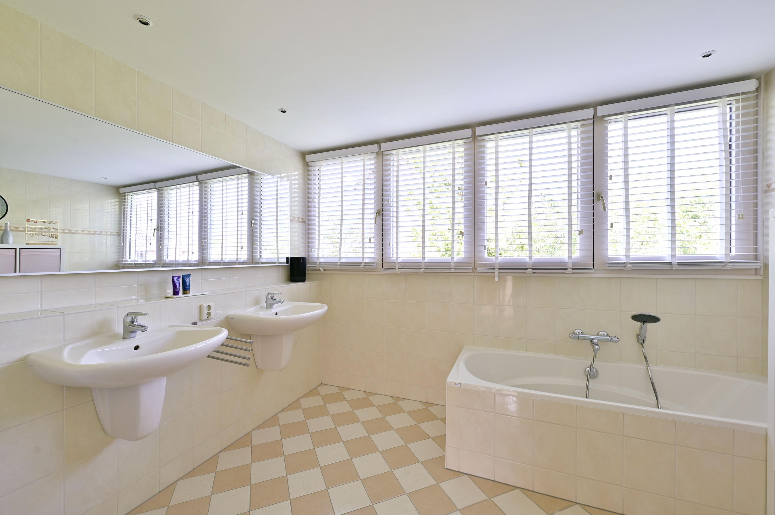 Next to the utility room is a spacious bedroom with air conditioning and an en-suite bathroom. This fully equipped bathroom features a bathtub with shower screen, toilet, and double washbasin — ideal as a master bedroom or for guests wanting ground-floor living. The entire ground floor is finished with beautiful natural stone flooring and underfloor heating for optimal comfort.