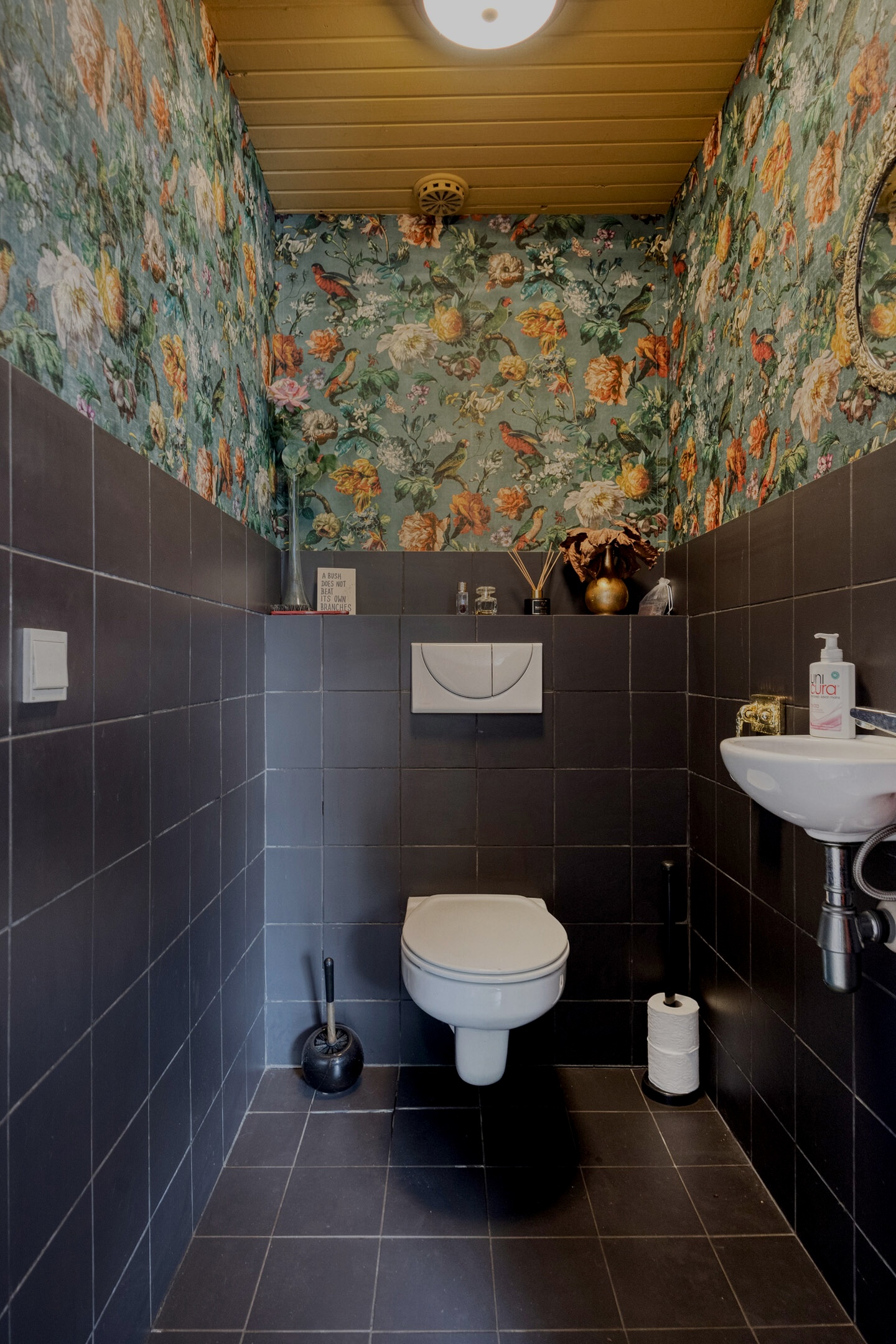 Tiled toilet with wall-mounted WC and washbasin;