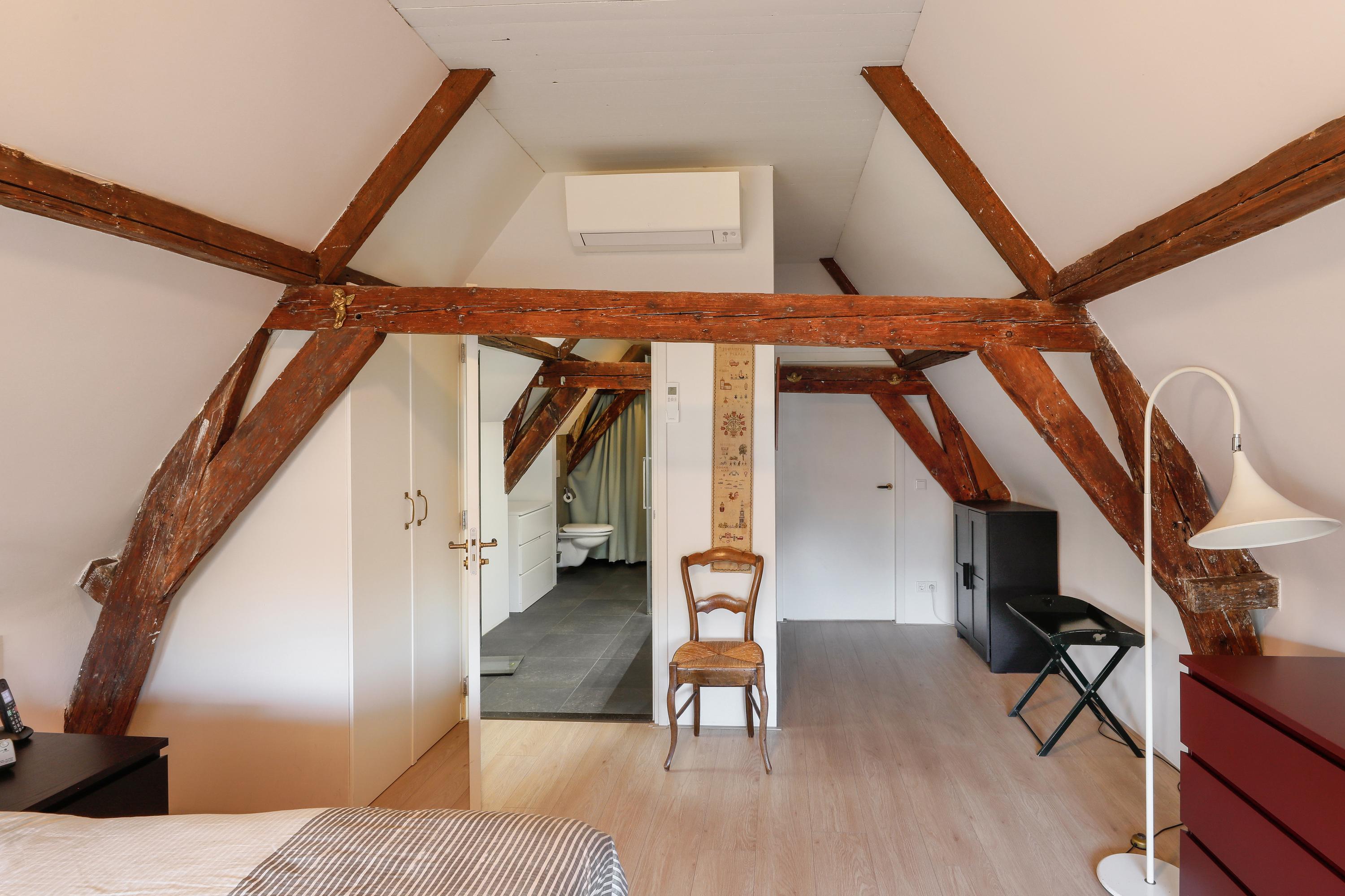 Dos dormitorios ocupan la segunda planta bajo las vigas originales del tejado. Uno de ellos ofrece vistas al agua; el otro dispone de una logia privada donde la luz de la tarde y la noche se filtra suavemente. El baño contemporáneo está equipado con ducha a ras de suelo, mueble lavabo y sanitario. Un ascensor y escaleras garantizan el acceso fluido entre plantas. El aislamiento incluye doble acristalamiento parcial y acristalamiento secundario, y la calefacción central garantiza el confort todo el año. Toldos exteriores y ventanas de tejado invitan tanto la sombra como la luz natural. El garaje privado con sótano aporta una comodidad poco habitual en el centro urbano, ideal para almacenaje, bicicletas o actividades personales. Cada detalle responde al estilo de vida urbano consciente, rodeado de historia y agua, en Den Bosch.