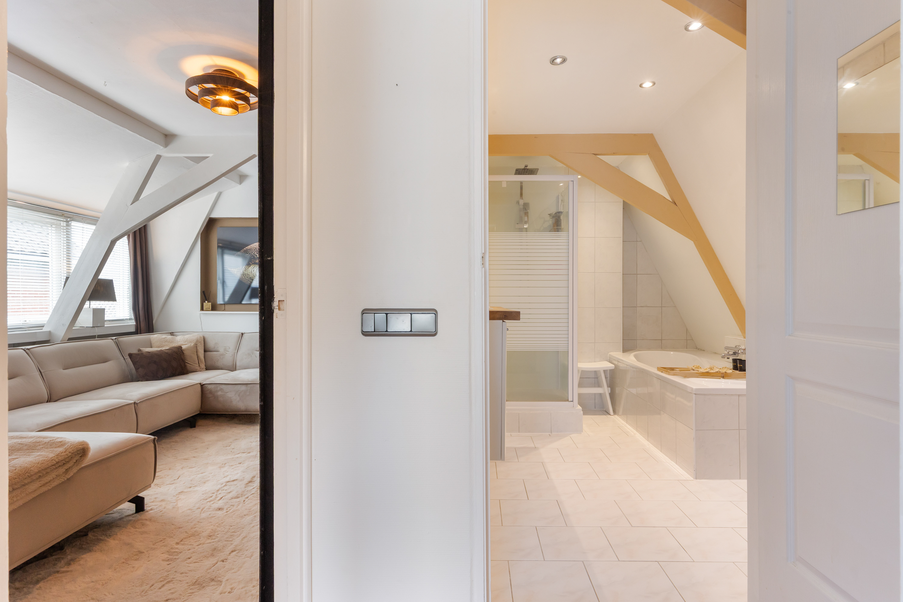 La villa independiente en Apeldoorn ofrece una refinada fusión entre arquitectura histórica y estilo contemporáneo inspirado en Ibiza, situada en una tranquila y arbolada zona residencial cerca del Paleis Het Loo y los bosques de Veluwe. Construida originalmente en 1910, con un característico tejado a varias aguas y ampliada en 2005, esta residencia se asienta sobre una parcela de 668 m², ofreciendo 188 m² de superficie habitable que equilibran intimidad con sorprendentes volúmenes.
