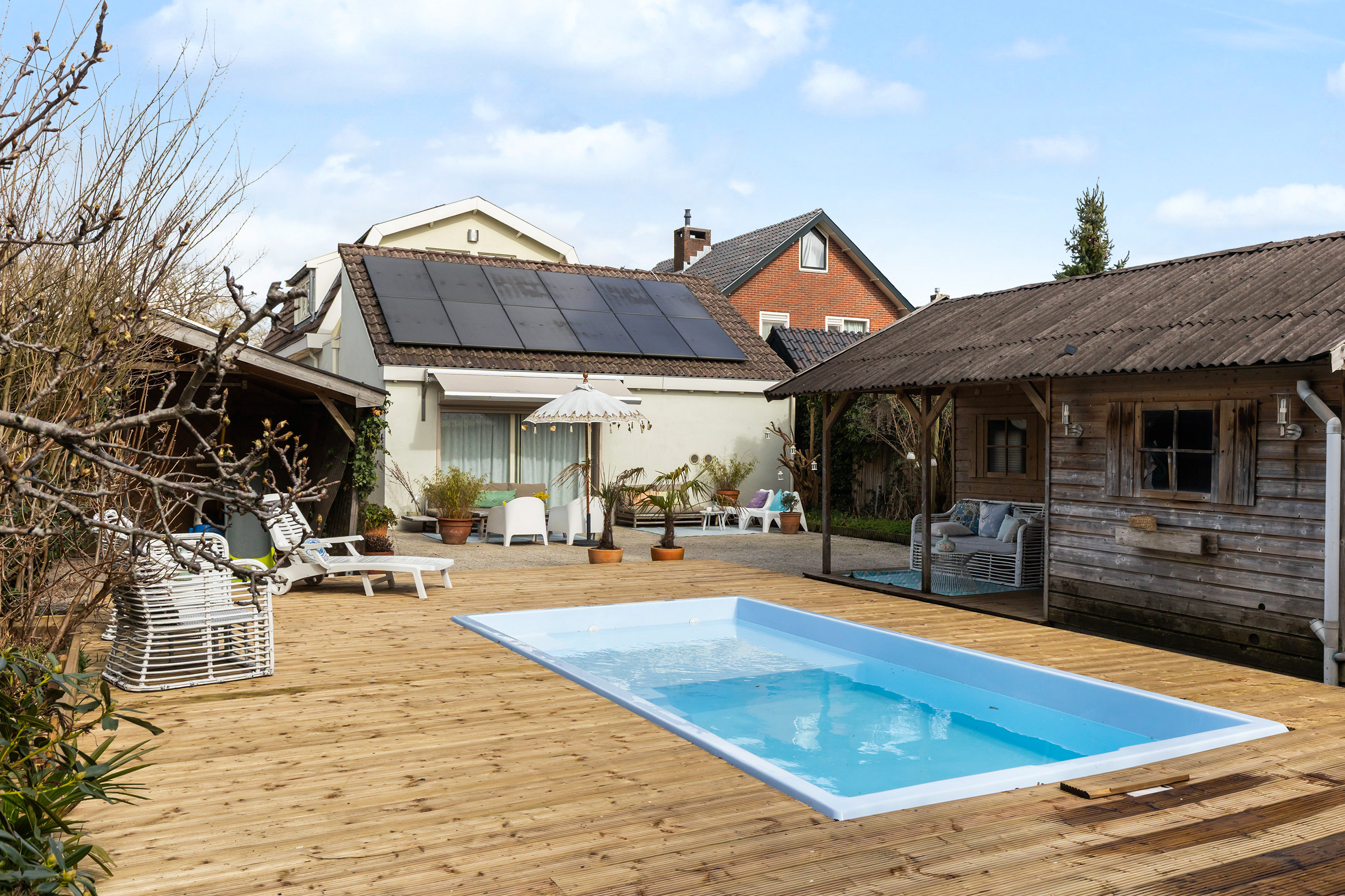 Cada dormitorio ha sido acabado con una estética propia de hotel boutique, climatización individual para confort durante todo el año. La casa cuenta con 23 paneles solares, dos garajes, aislamiento moderno y sistema eléctrico renovado. La versatilidad del diseño admite convivencia multigeneracional o teletrabajo. El jardín amurallado garantiza privacidad, con tomas eléctricas exteriores, terrazas sombreadas y una segunda edificación auxiliar con porche. Con aparcamiento privado y fácil acceso al centro de Apeldoorn, esta villa independiente representa una oportunidad única para disfrutar de un estilo de vida elegante y versátil.