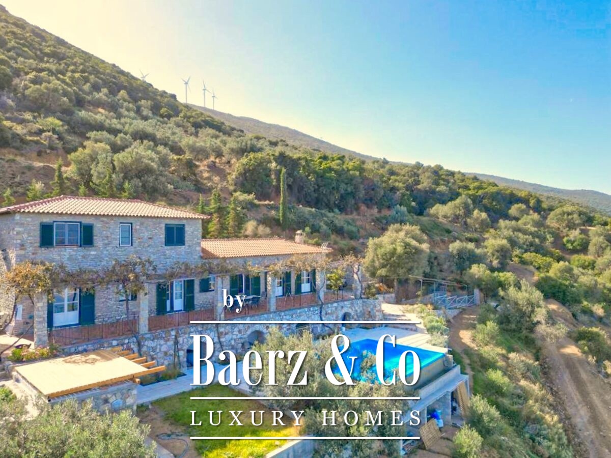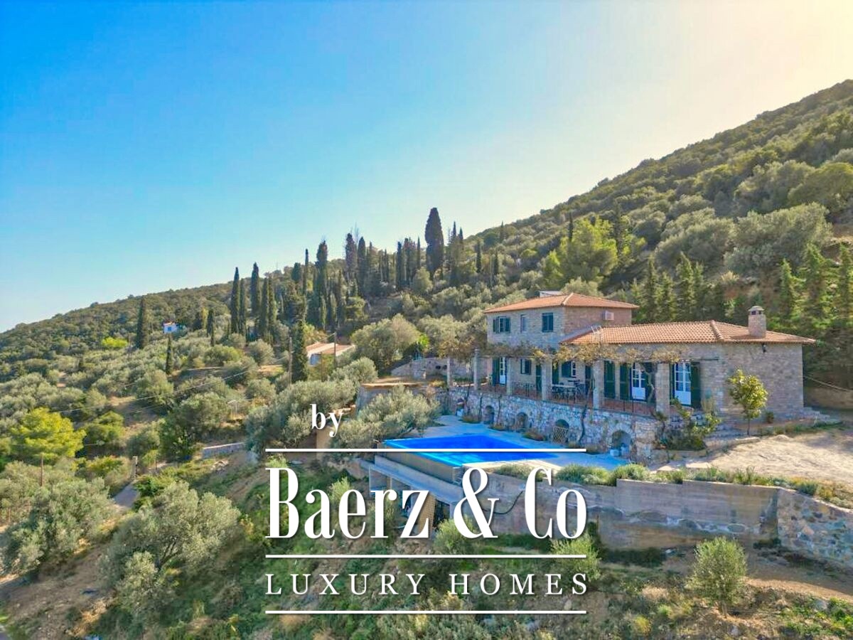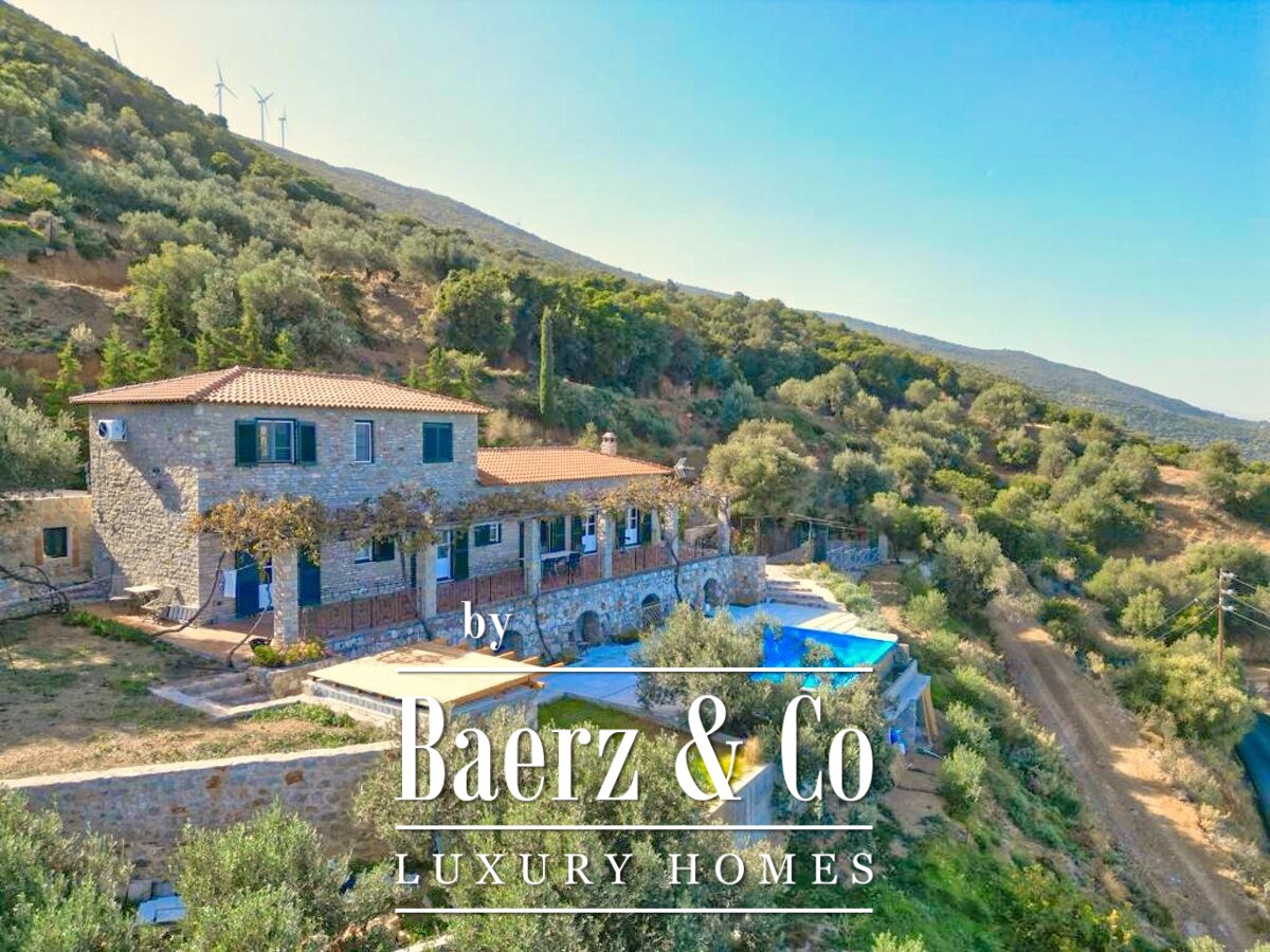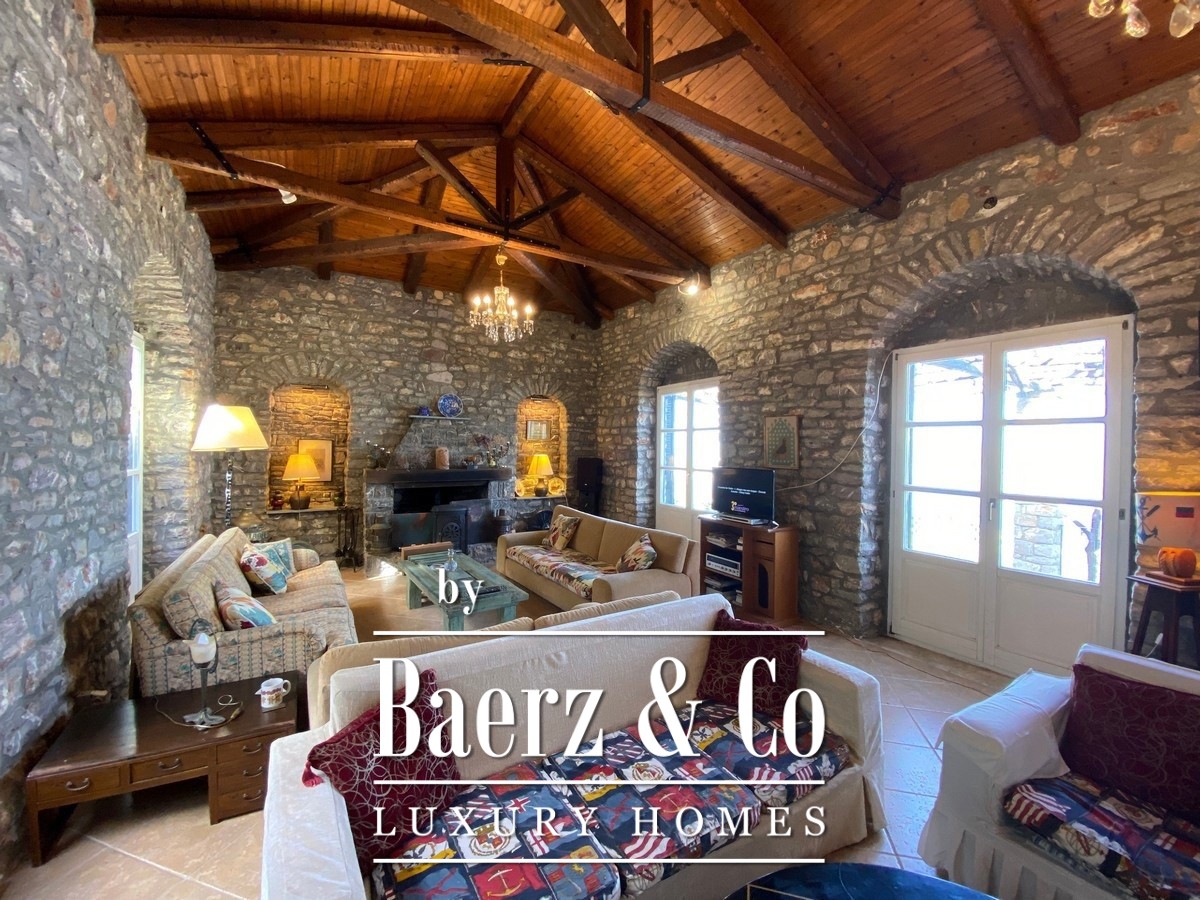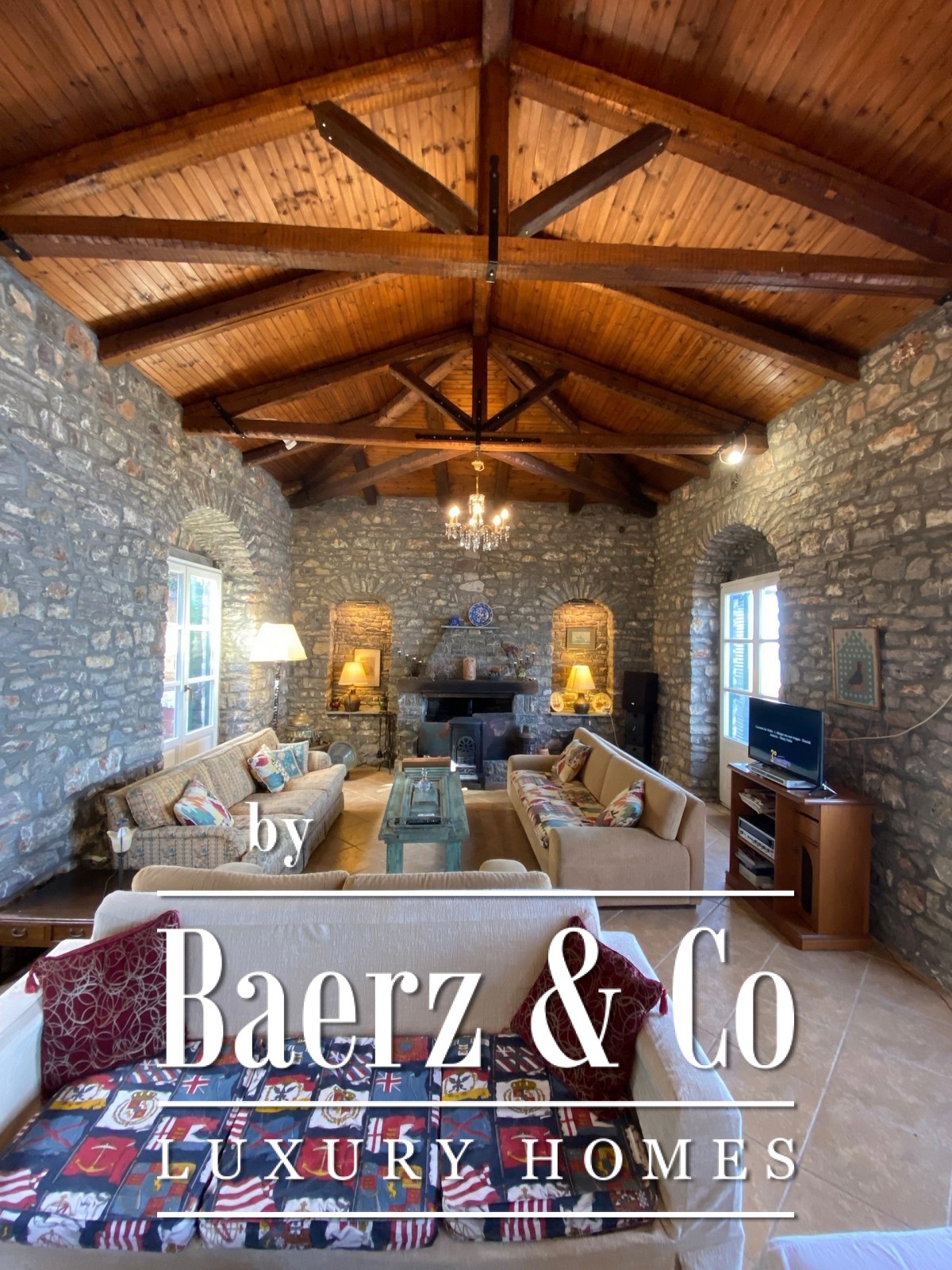 La villa de piedra Galatas descansa sobre una tranquila ladera, ofreciendo vistas panorámicas al mar y fusionando la arquitectura griega tradicional con una comodidad moderna y discreta. Su interior de 180 m² alberga espacios amplios y luminosos, con una zona central de estar protagonizada por una imponente chimenea de piedra. Cada estancia, desde la cocina independiente hasta los tres dormitorios y los dos baños, ha sido diseñada pensando en la funcionalidad y el lujo sutil.