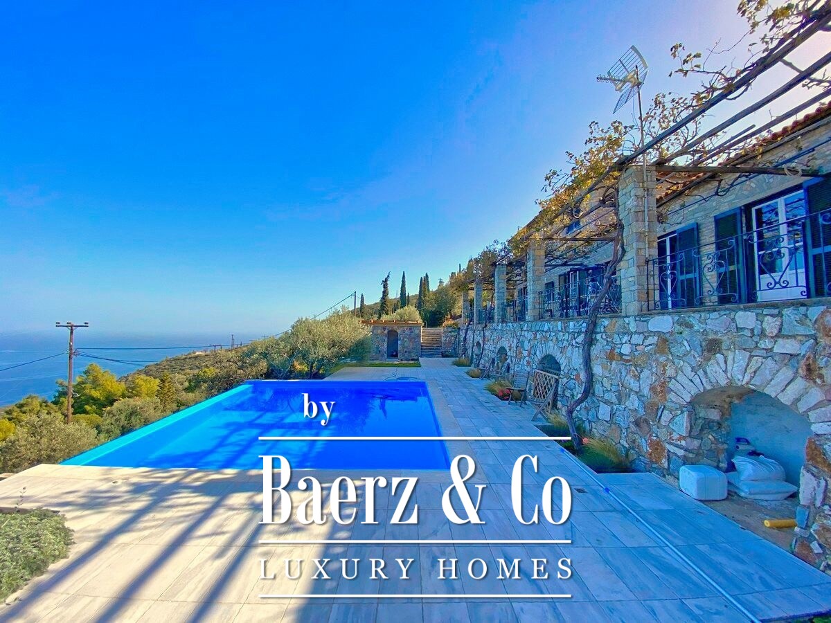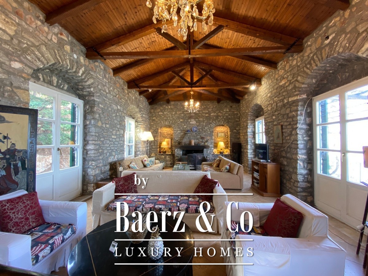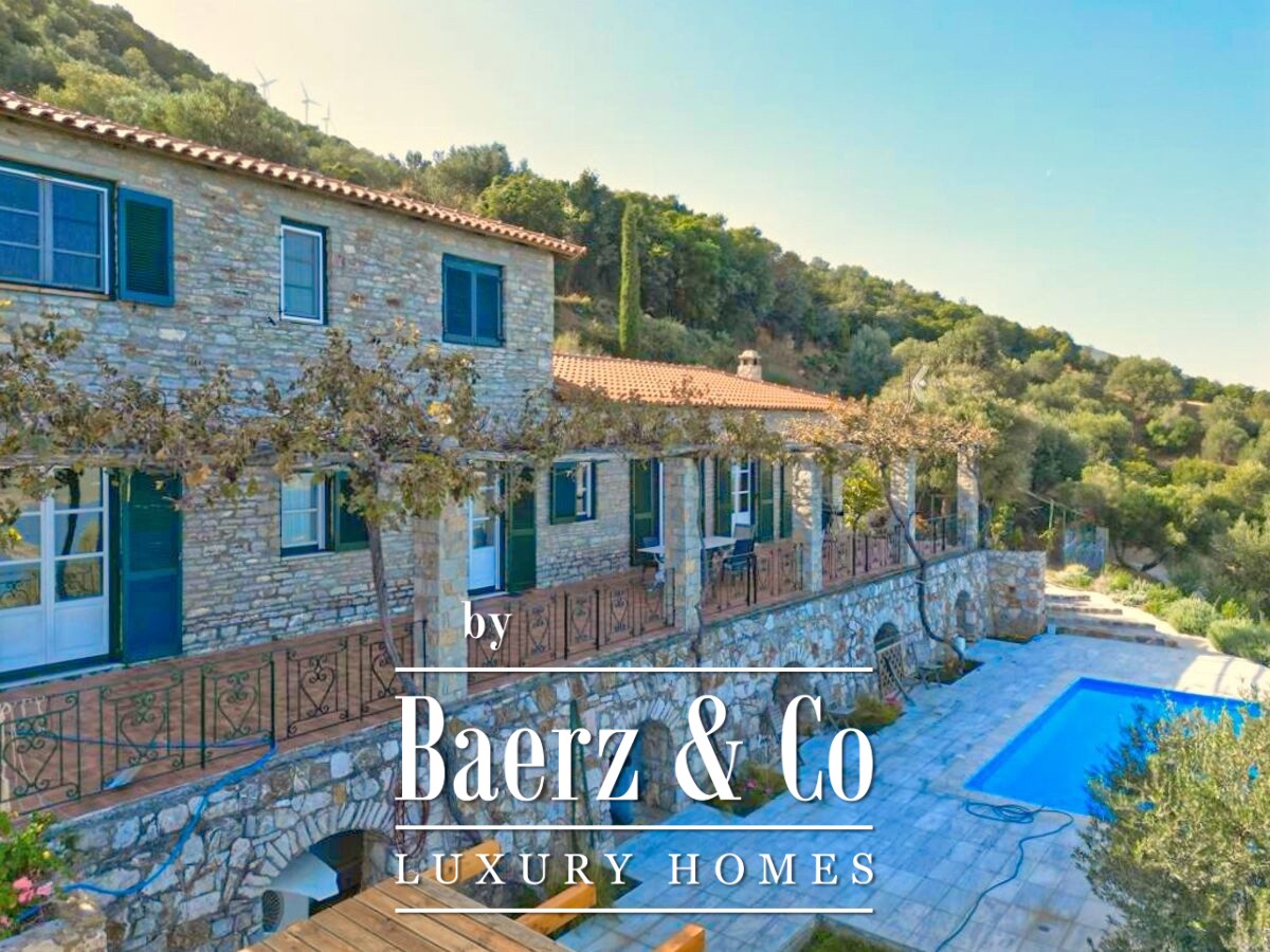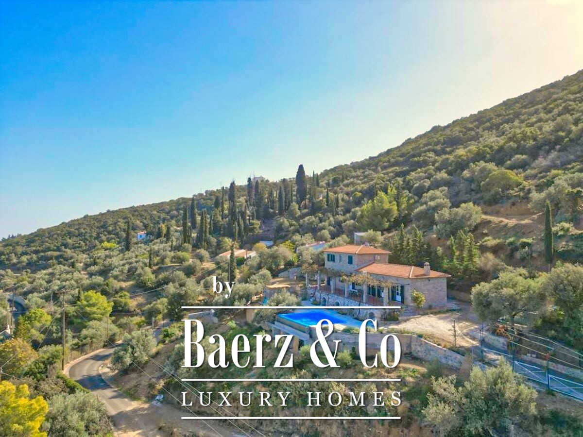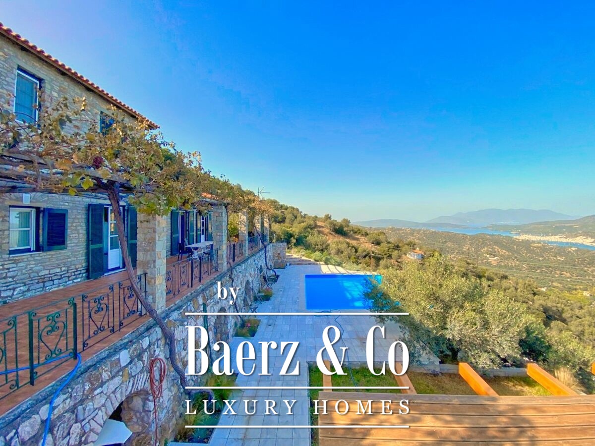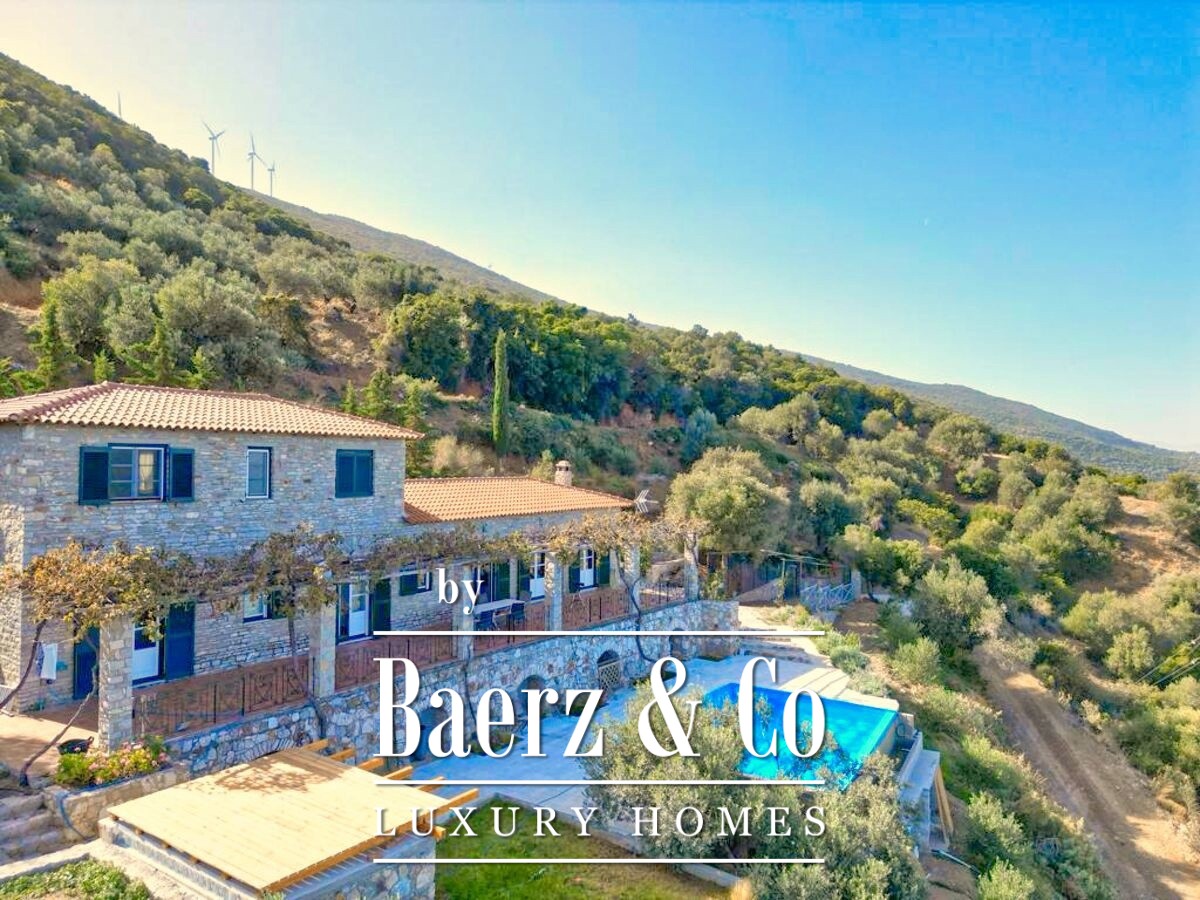 La villa de piedra Galatas descansa sobre una tranquila ladera, ofreciendo vistas panorámicas al mar y fusionando la arquitectura griega tradicional con una comodidad moderna y discreta. Su interior de 180 m² alberga espacios amplios y luminosos, con una zona central de estar protagonizada por una imponente chimenea de piedra. Cada estancia, desde la cocina independiente hasta los tres dormitorios y los dos baños, ha sido diseñada pensando en la funcionalidad y el lujo sutil.