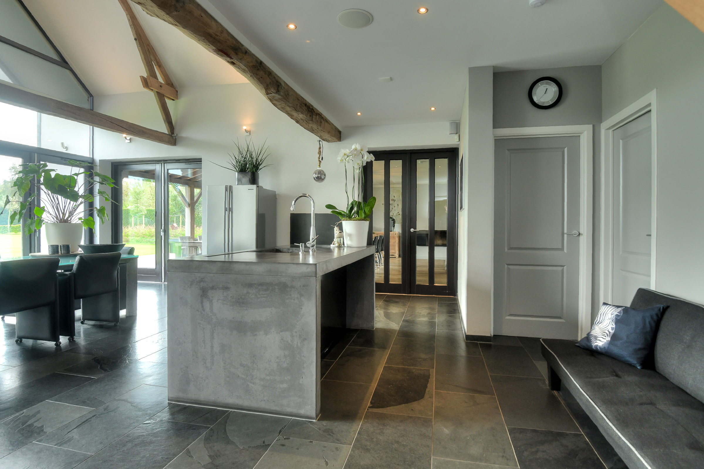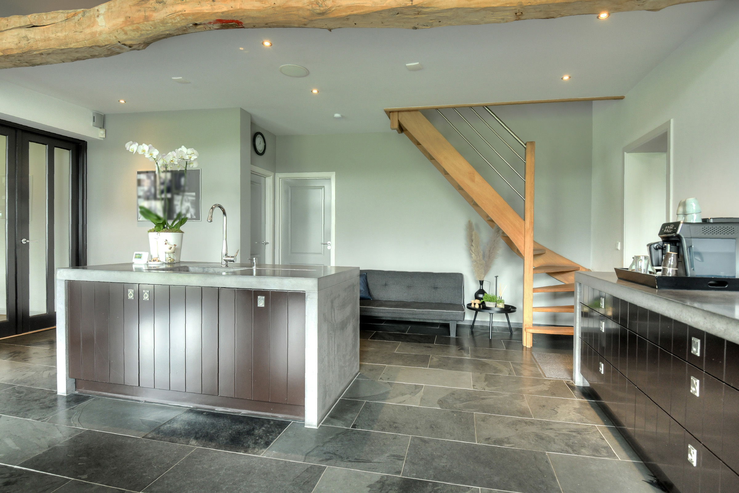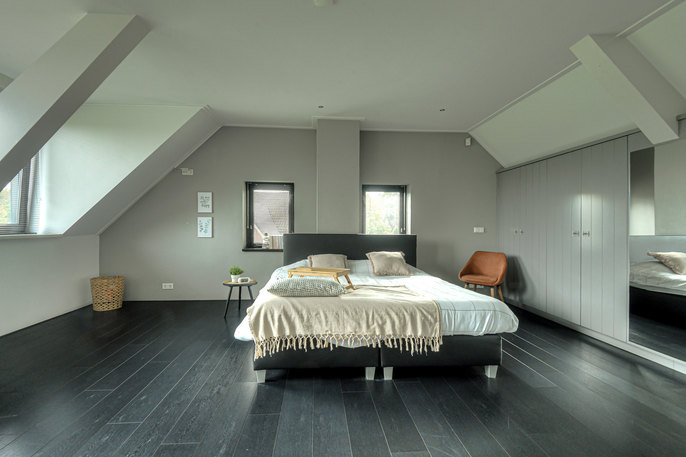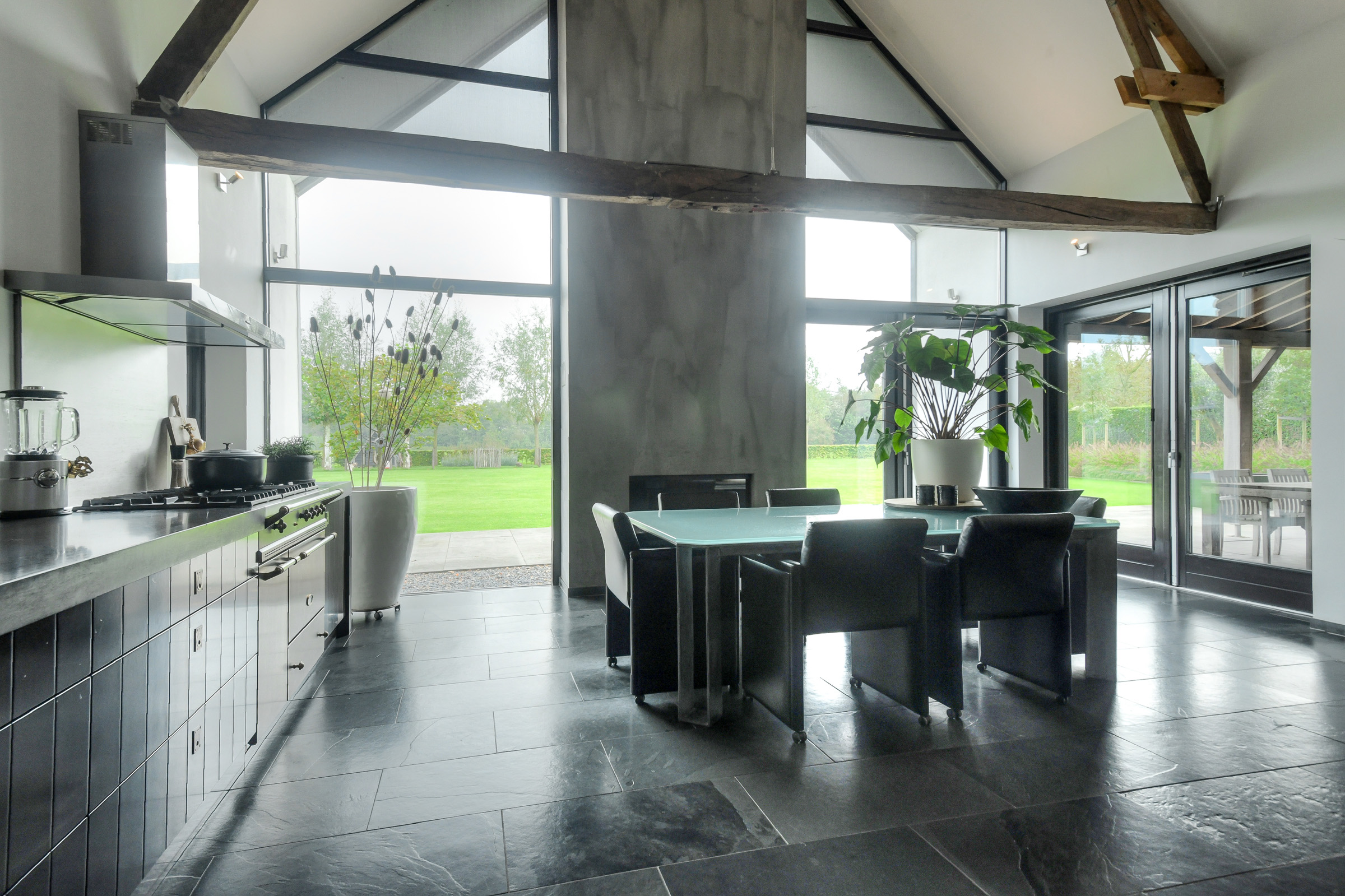 Esta villa independiente en Galder se alza sobre una extraordinaria finca de 25.110 m² lindando con la reserva natural Markdal. Rodeada de vegetación intacta y prados, la propiedad garantiza total privacidad en un entorno natural poco común al sur de Breda. La vivienda principal se despliega sobre 224 m², ofreciendo tres dormitorios completos y una sucesión fluida de espacios de estar. Los suelos de roble aportan calidez al salón con forma de L, donde chimeneas modernas y puertas francesas conducen a una veranda con amplias vistas al paisaje. La cocina-comedor se convierte en el corazón del hogar, realzada por una isla de encimera de hormigón, una cocina Lacanche a gas y puertas dobles al jardín que se abren a céspedes cuidados y a la reserva natural más allá.