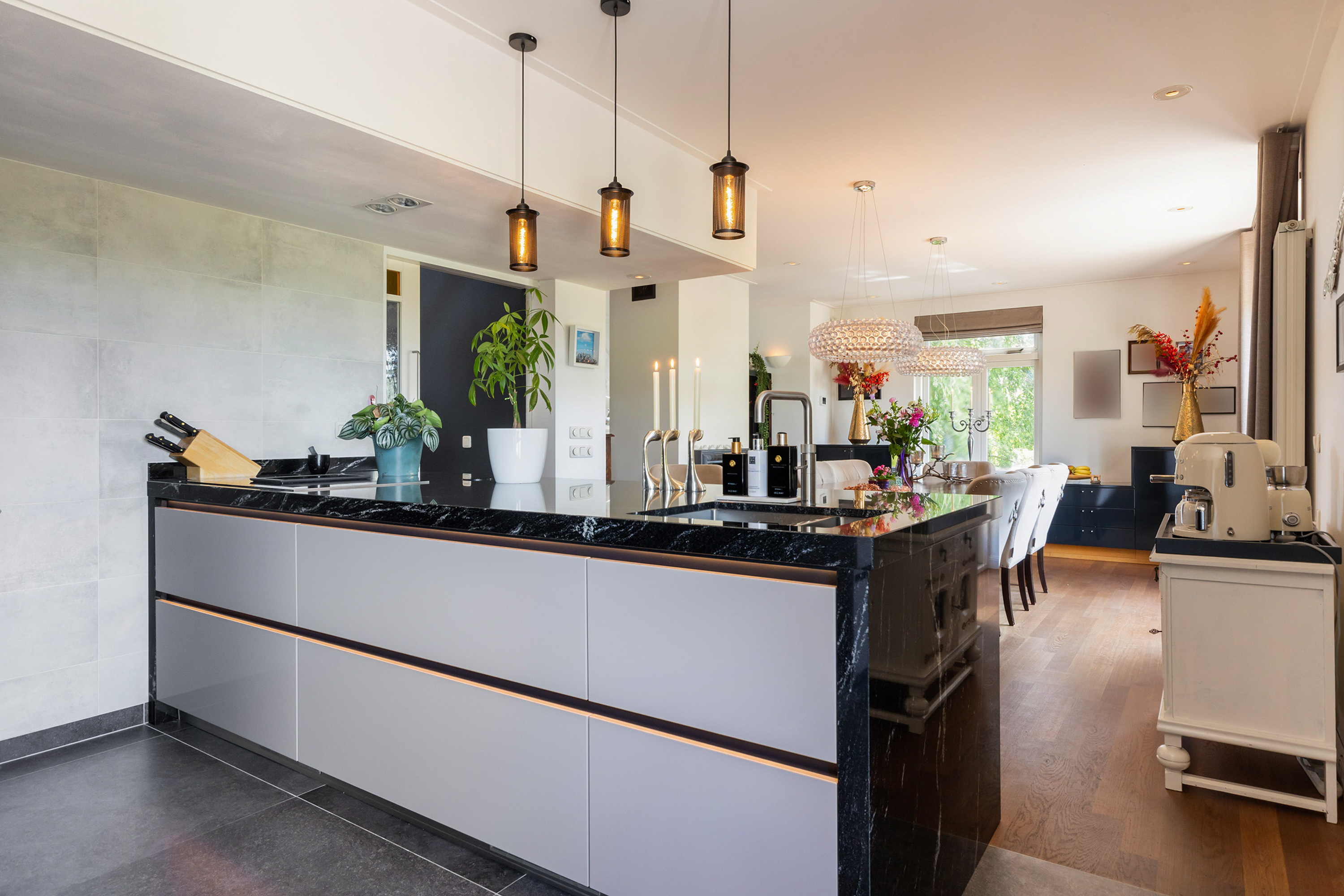 La villa se distribuye en cuatro niveles, proporcionando 421 m² de espacio versátil. A la altura del dique, la sala principal fusiona ambiente y confort, con vistas panorámicas enmarcadas por puertas francesas que conducen a un amplio balcón. El despacho cuenta con una chimenea con carácter y las zonas de estar, comedor y cocina se conectan mediante una chimenea de cristal, lo que permite tanto la división como la fluidez.
