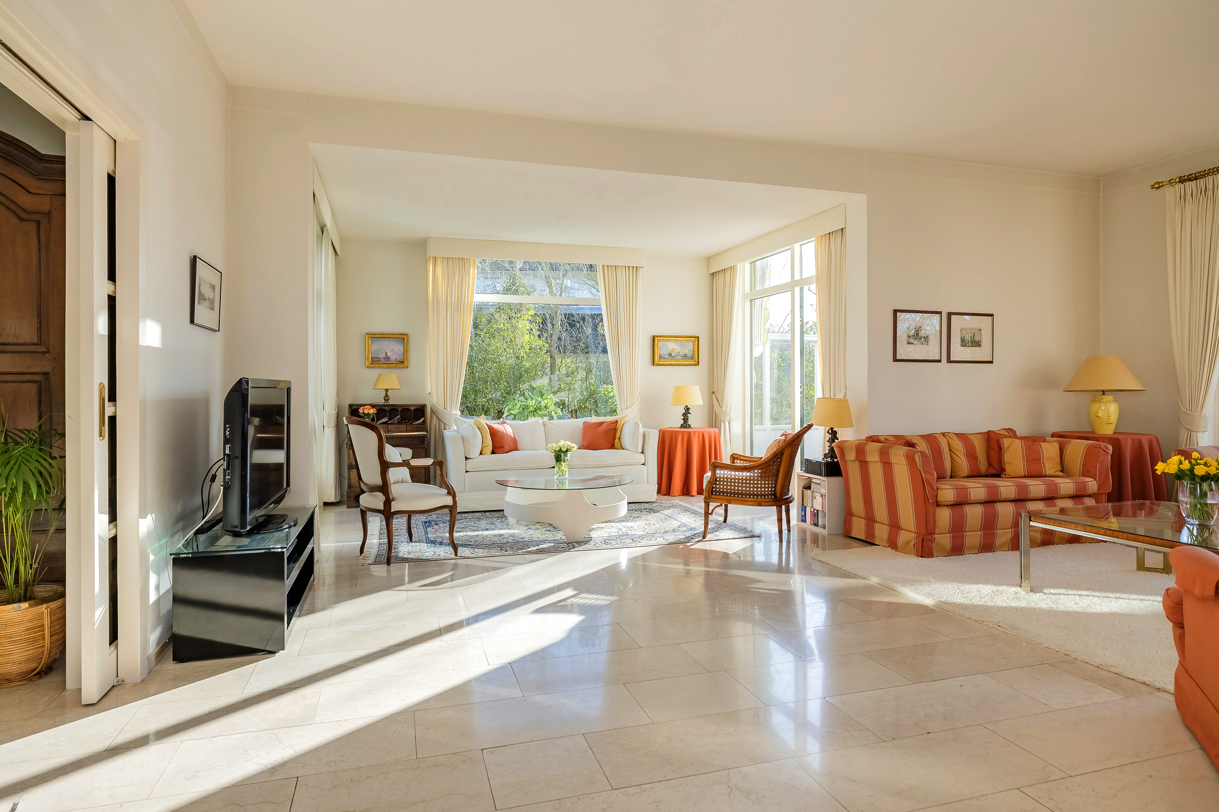 El espacioso salón cuenta con chimenea y suelo radiante, aportando calidez, mientras que los suelos de mármol y las vistas luminosas al jardín crean un ambiente sereno. Un refinado comedor en suite se conecta de manera natural, y la terraza acristalada, bañada por el sol, acoge la luz de la mañana. La cocina está diseñada para reuniones agradables e incluye una chimenea de gas y electrodomésticos de última generación.