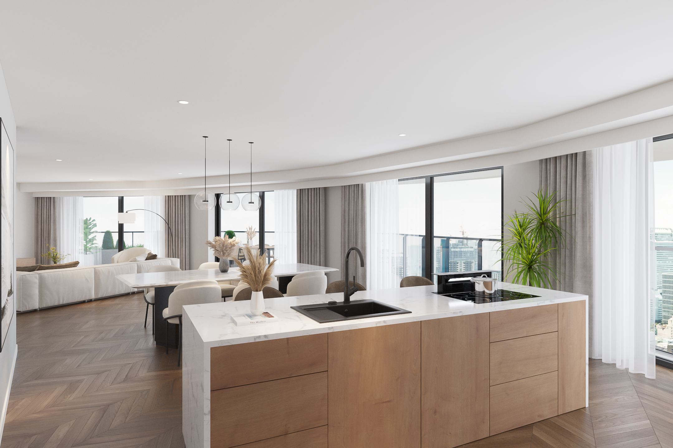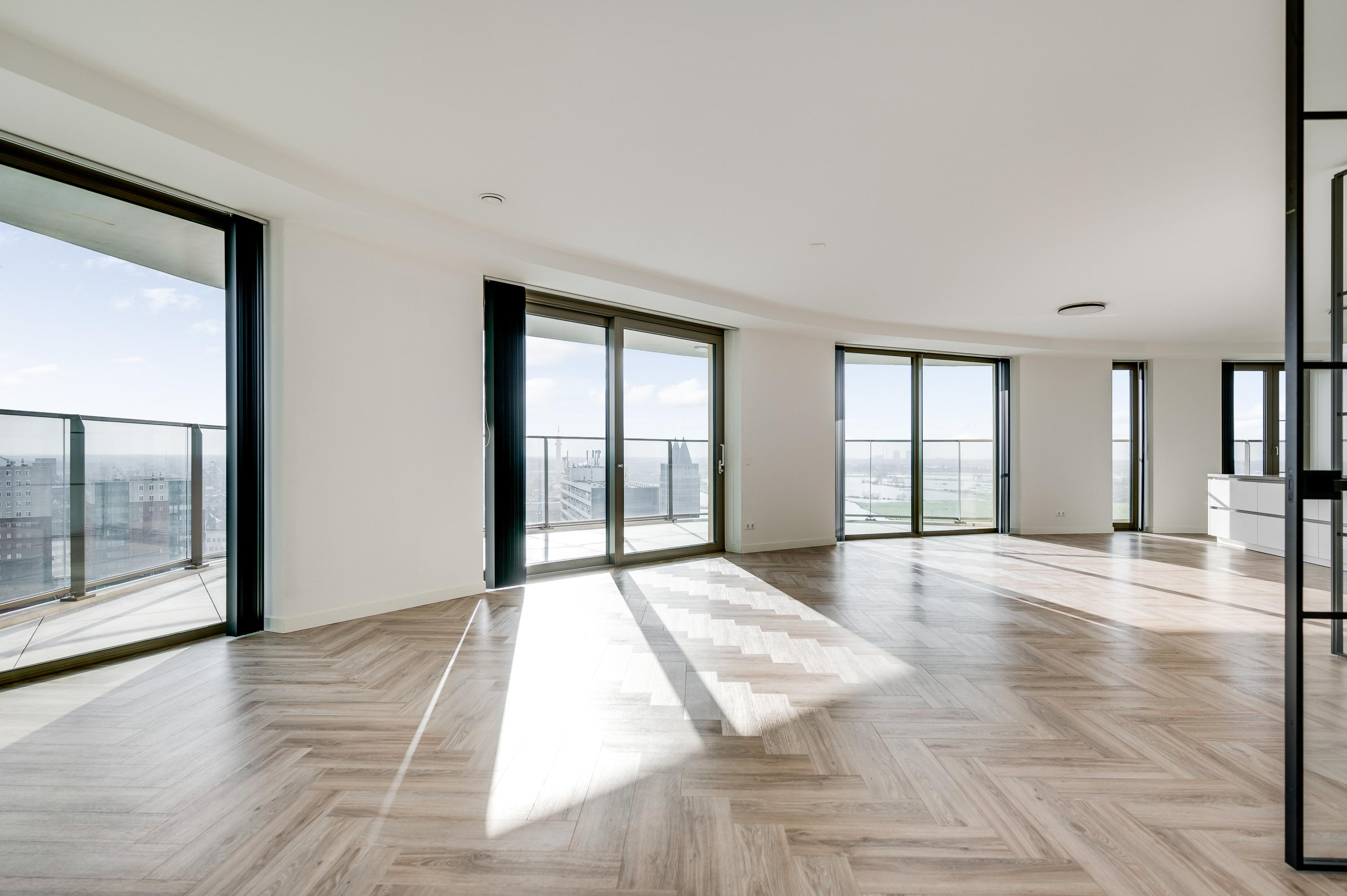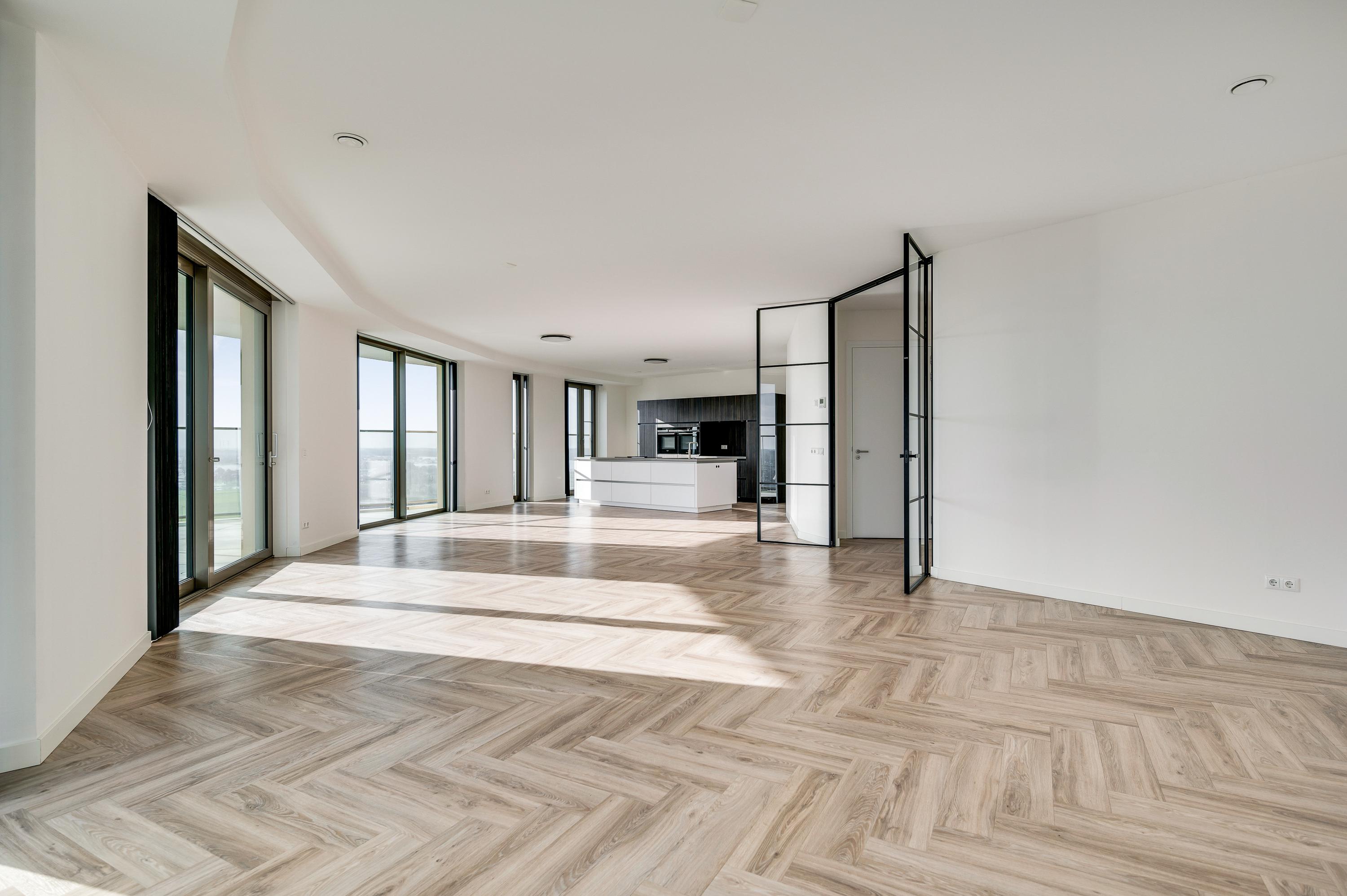 El ático Roermond ocupa la decimocuarta planta de Manhattan Urban Residence, diseñado para una vida contemporánea y moldeado por las amplias vistas de Maasplassen. Este ático en Roermond ofrece una superficie habitable de aproximadamente 185 m², realzada por techos de casi tres metros y ventanales de suelo a techo que bañan el interior de luz y enmarcan vistas panorámicas sobre la ciudad y el agua.
