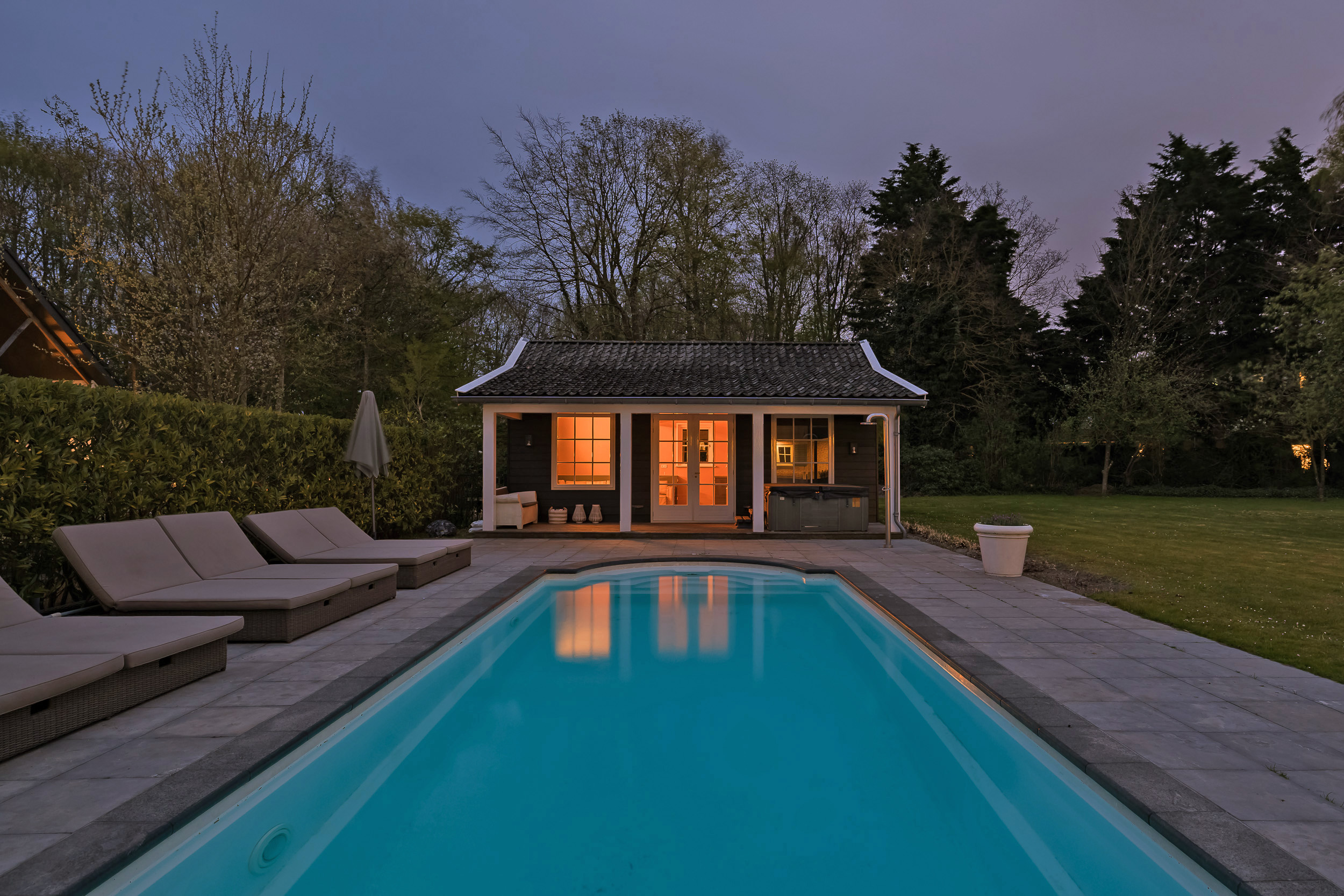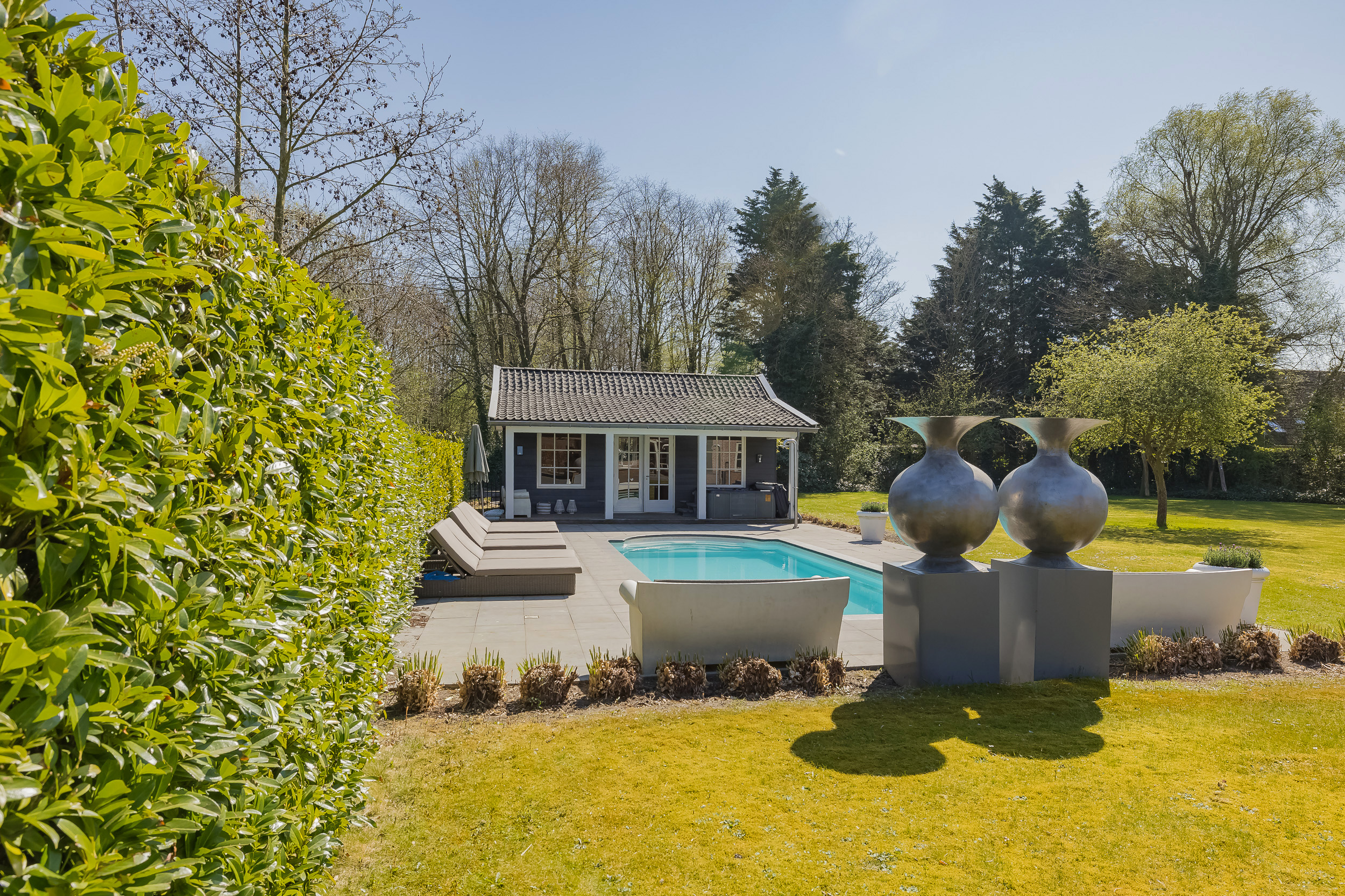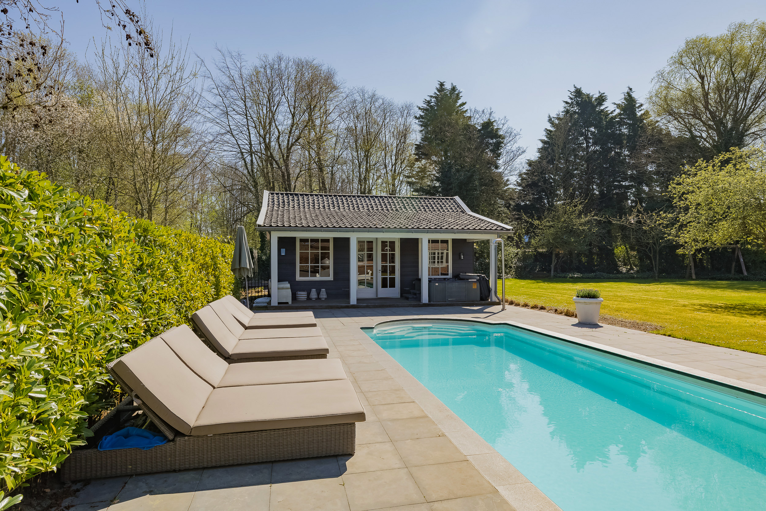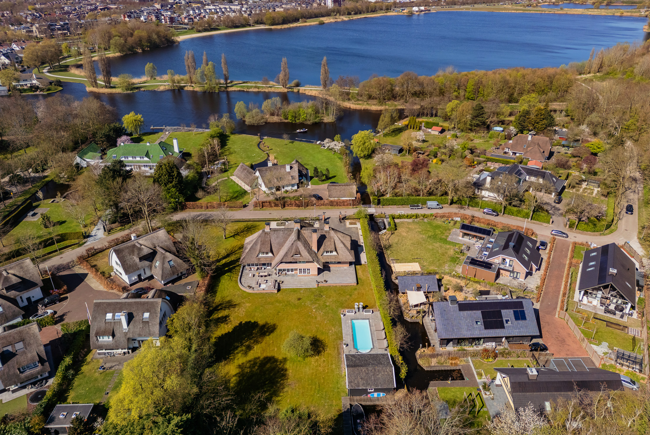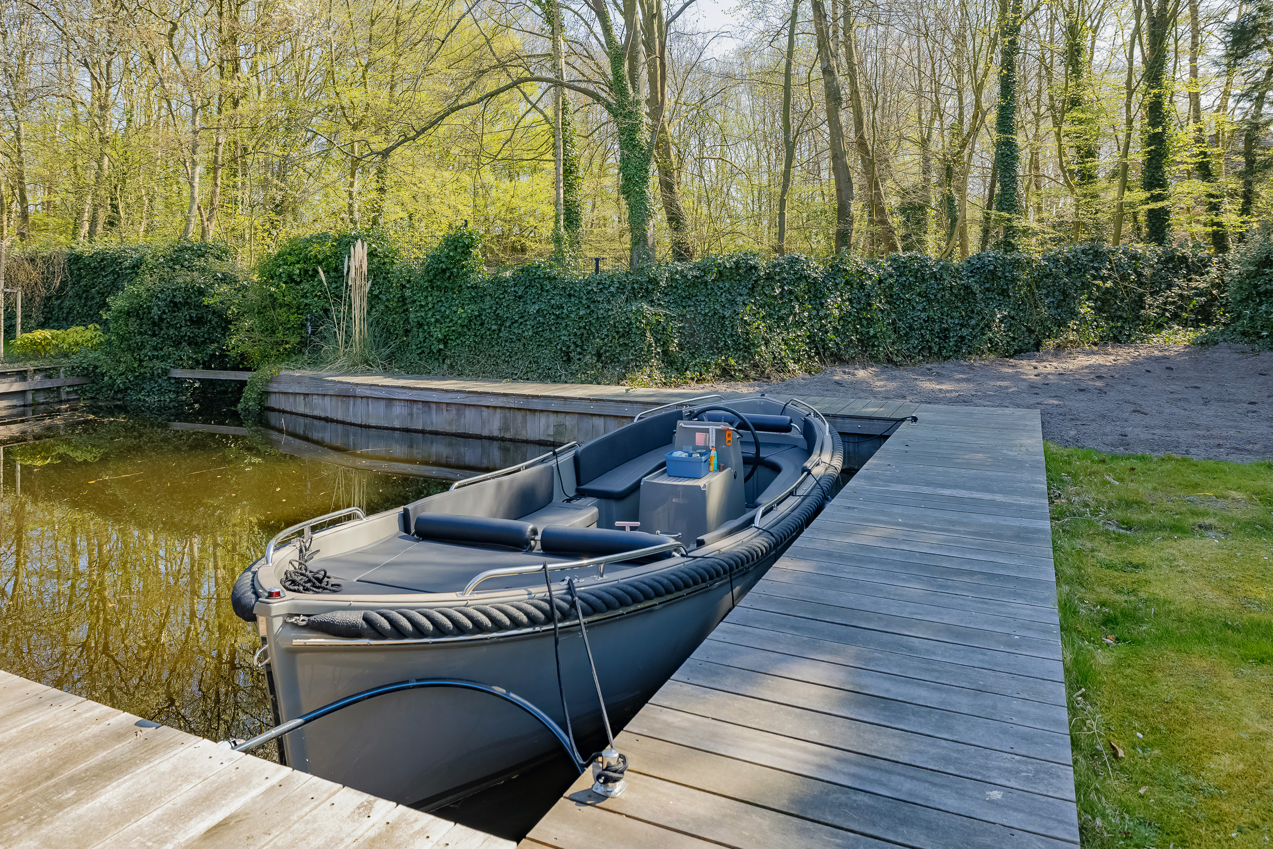 En el exterior, la privacidad y la tranquilidad permanecen intactas gracias a un jardín perimetral maduro, piscina climatizada con casa anexa y amplias terrazas en la parte delantera y trasera. El agua rodea la propiedad, que dispone de un muelle privado para hasta tres embarcaciones, brindando acceso privilegiado a los Kagerplassen y los canales de Leiden. Hay abundante aparcamiento, acceso seguro con portón eléctrico y un garaje doble de 70 m².
