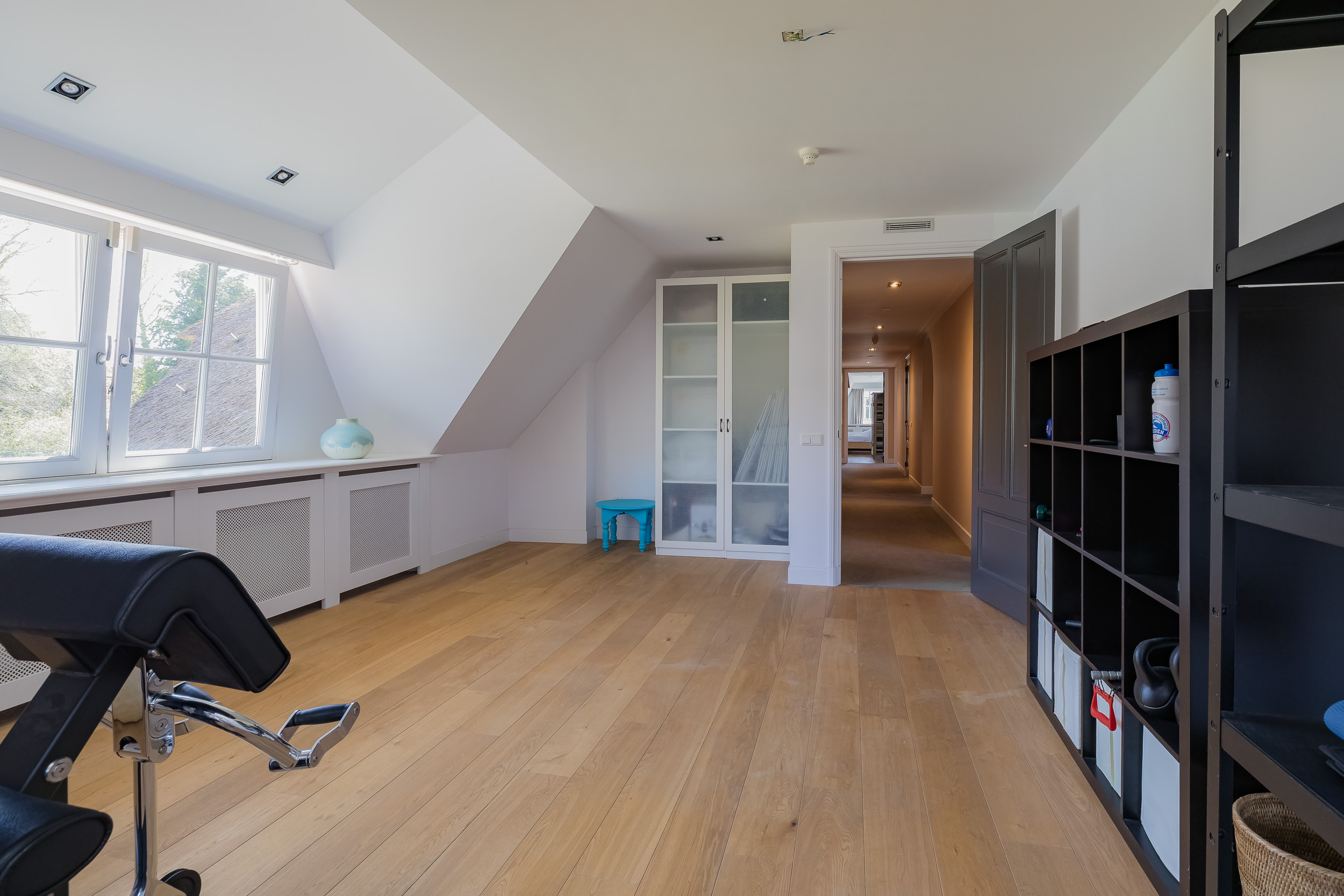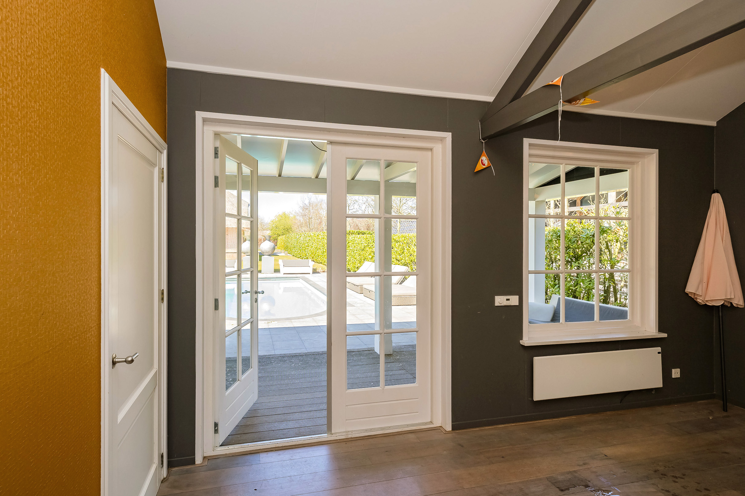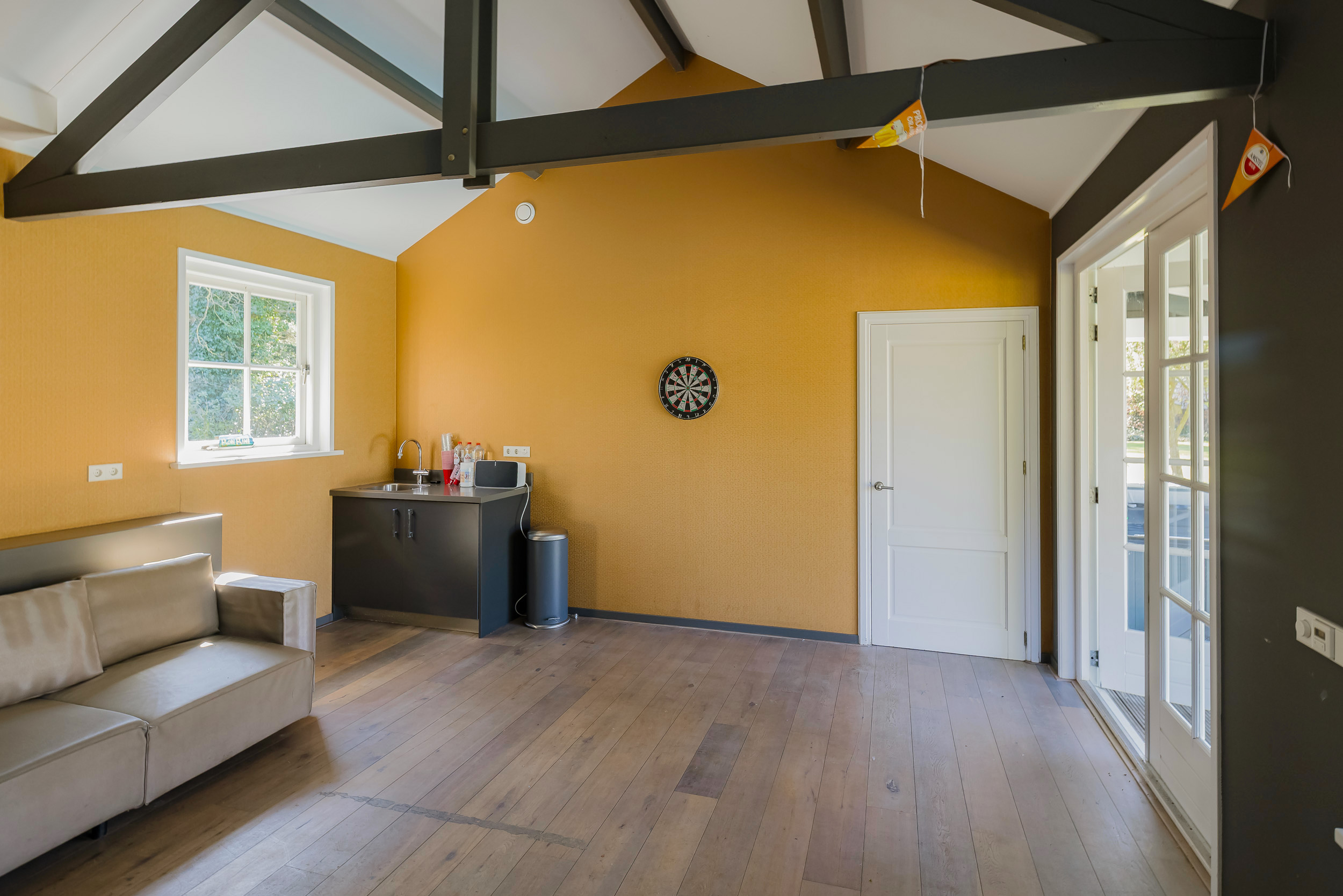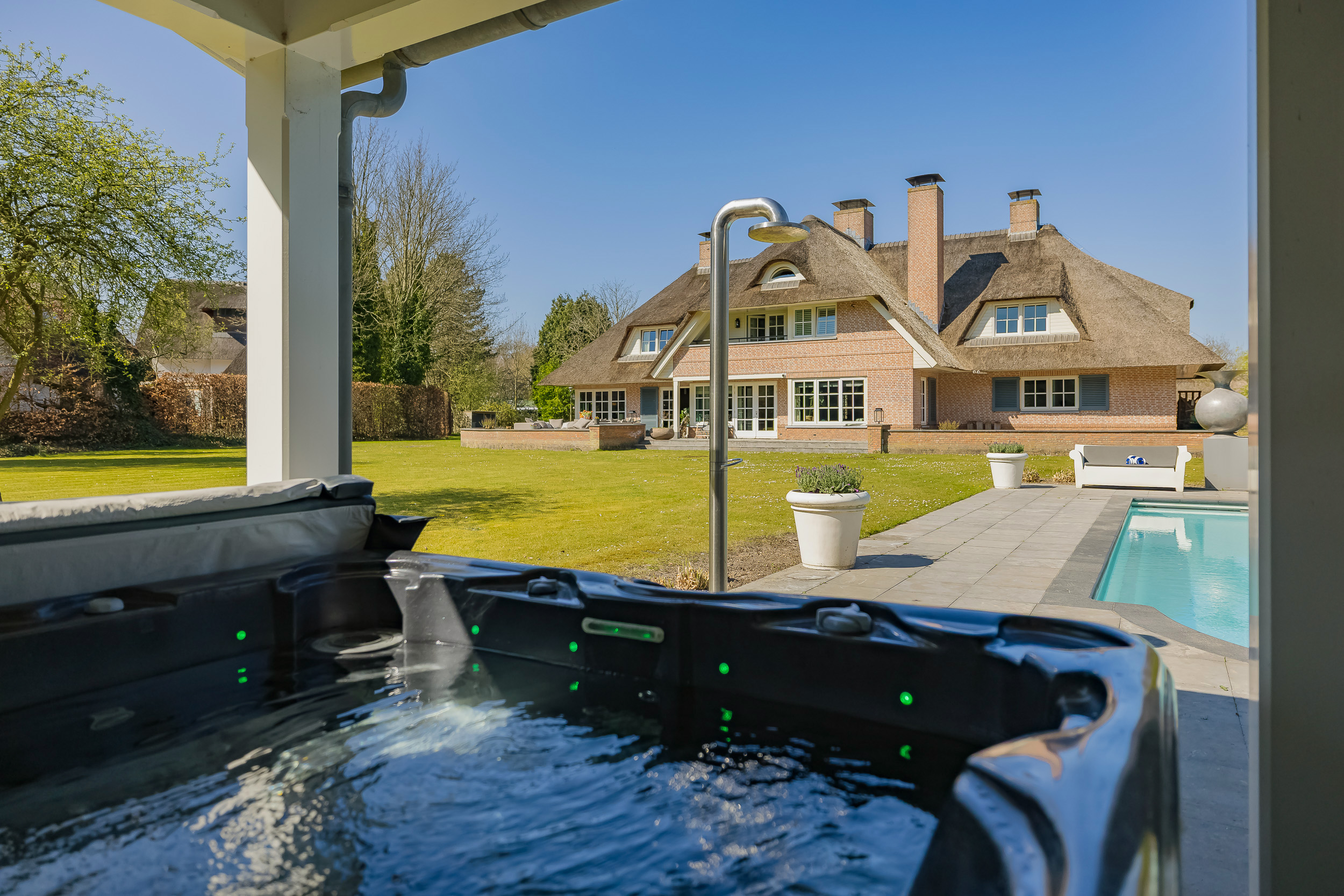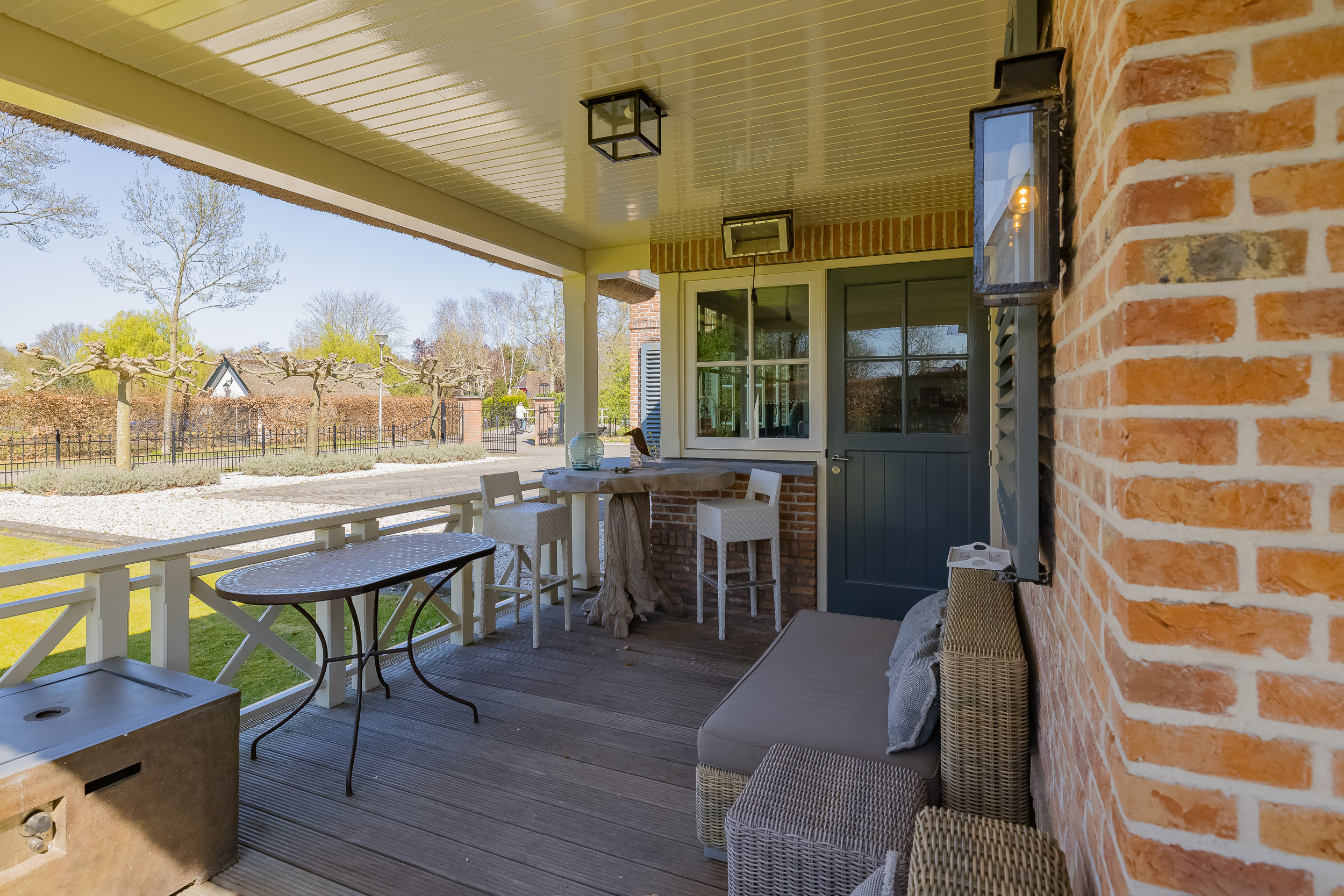 En el exterior, la privacidad y la tranquilidad permanecen intactas gracias a un jardín perimetral maduro, piscina climatizada con casa anexa y amplias terrazas en la parte delantera y trasera. El agua rodea la propiedad, que dispone de un muelle privado para hasta tres embarcaciones, brindando acceso privilegiado a los Kagerplassen y los canales de Leiden. Hay abundante aparcamiento, acceso seguro con portón eléctrico y un garaje doble de 70 m².