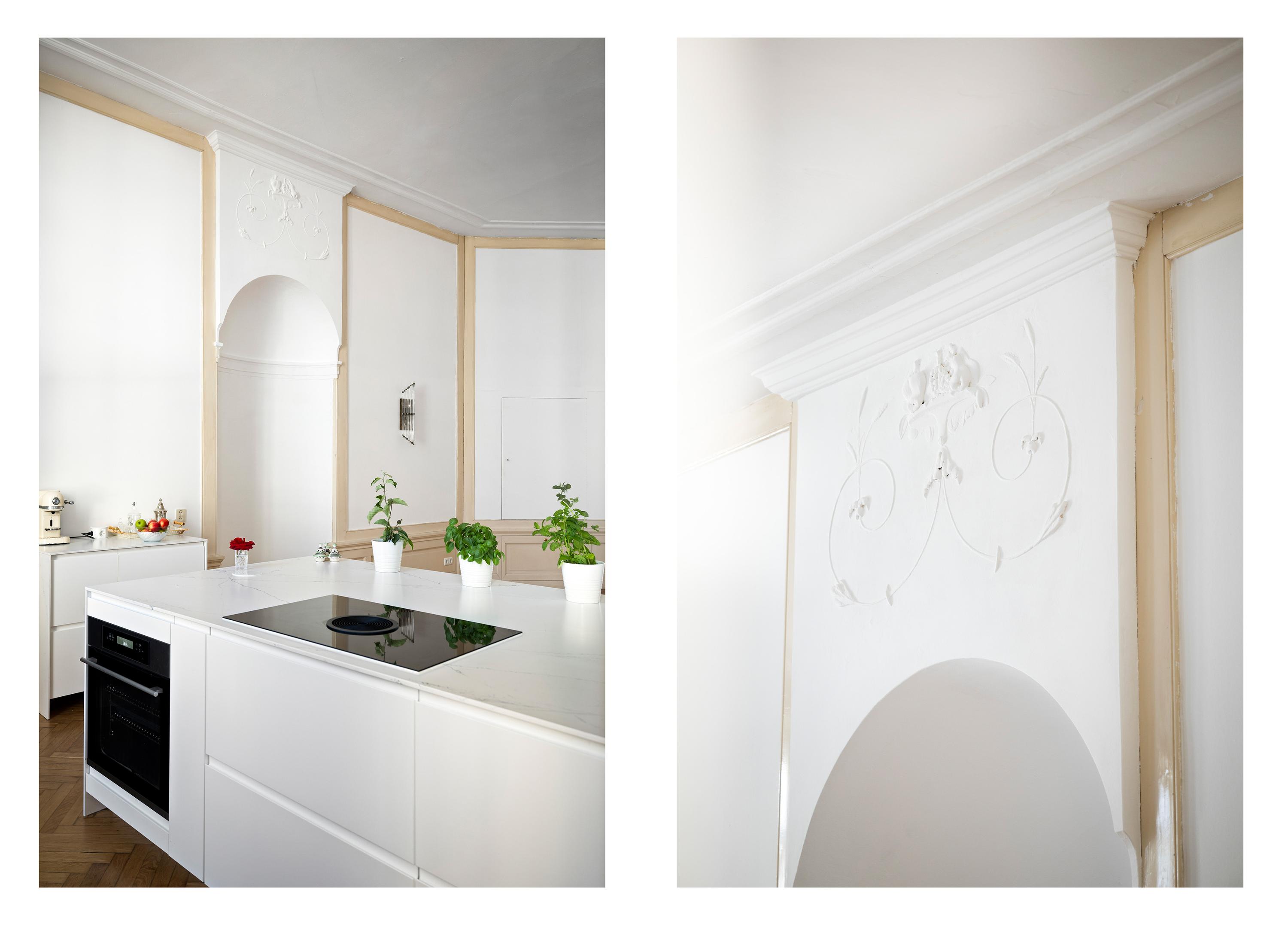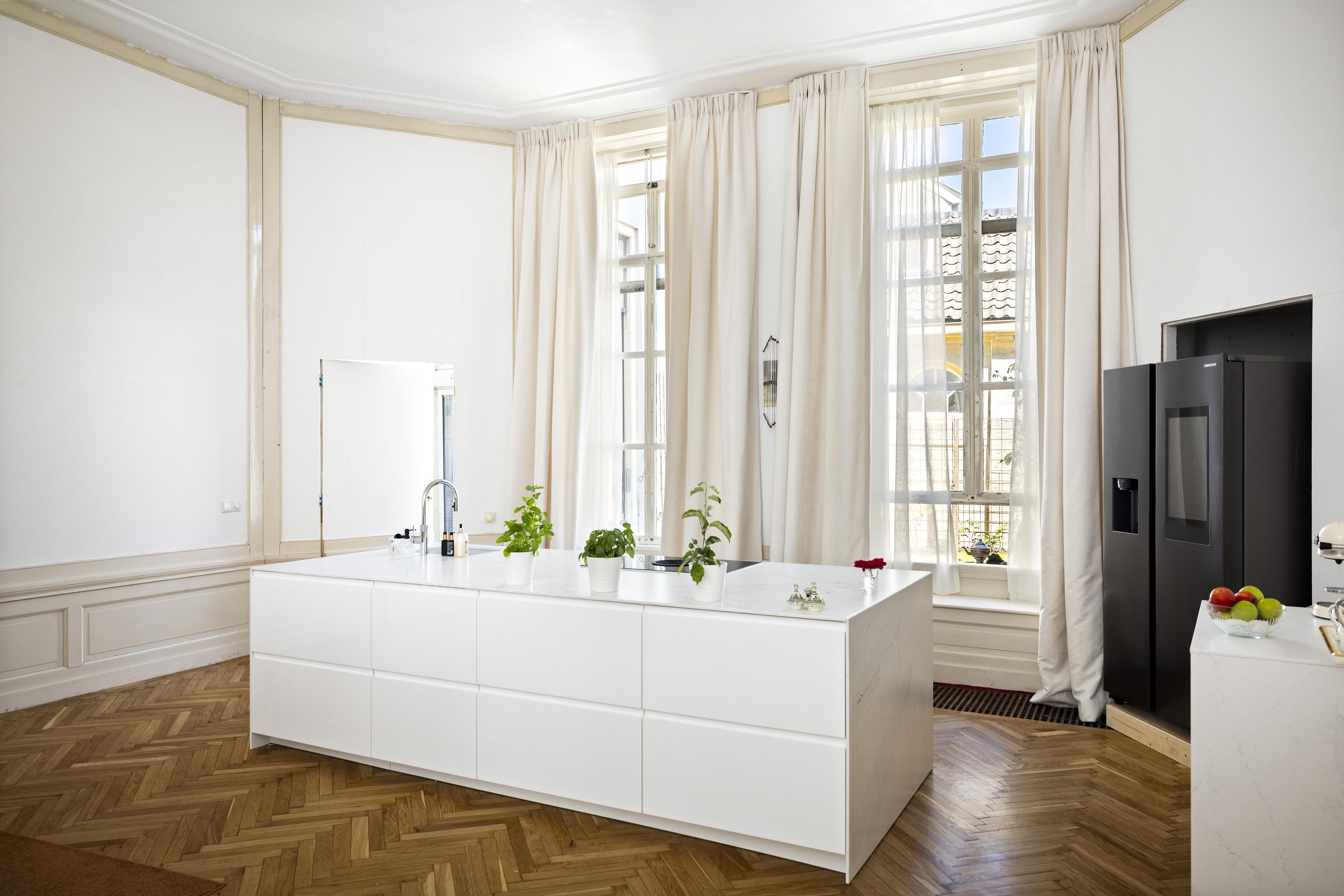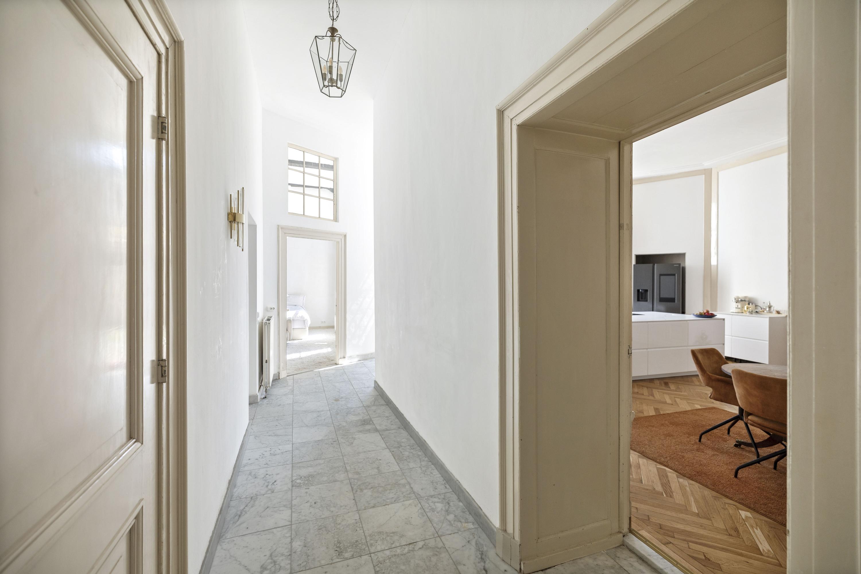 Cruzando la entrada doble clásica, el vestíbulo da la bienvenida con su suelo de mármol y abundante luz natural. Una zona de estar y cocina combinada de casi 100 m² ancla la planta principal. El salón, de 43 m², presenta bancos de ventana originales y una chimenea ornamental de época, mientras que los suelos de roble en espiga aportan calidez y elegancia. La cocina está equipada con muebles blancos sin tiradores, electrodomésticos de alta gama, incluyendo una placa de inducción con extractor integrado y un gran frigorífico-congelador.